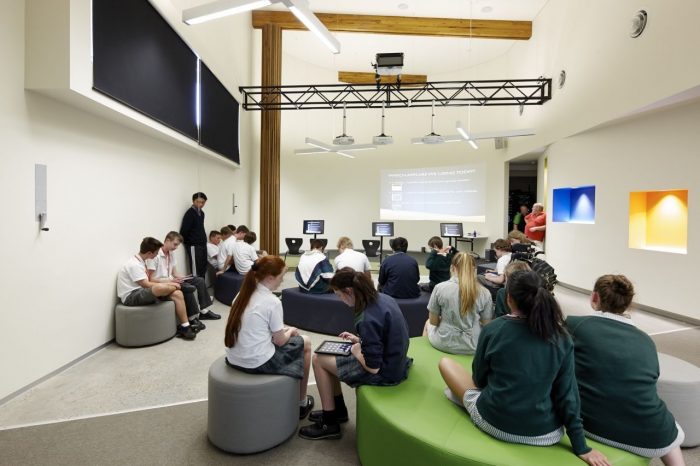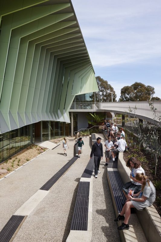 The program for the Centre’s educational aspects includes a 100-student presentation area, basic laboratories, TAFE labs + ancillary spaces, technologically equipped collaboration areas and a Discovery Centre aimed at immersing the school’s senior secondary students in the practices and implementation of sustainable building techniques and technologies.