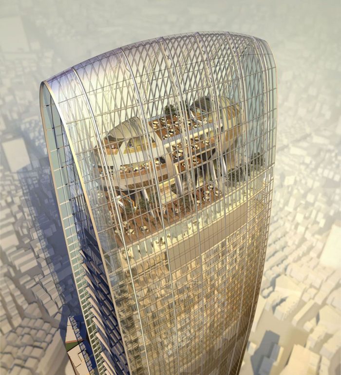 The columns are arranged only along the perimeter, resulting in a column free space. The building is curved inwards from two sides. The resulting ‘spring or fountain’ like shape symbolises the wealth and prosperity of Shenzhen. The floor plan is not square. The East and West facades are flared and more slender than the North and South facades. To combat problems of swing or drift, and to increase robustness of the tower, the top of the building is not used for services. Rather it culminates in a curtain wall and steel structure.