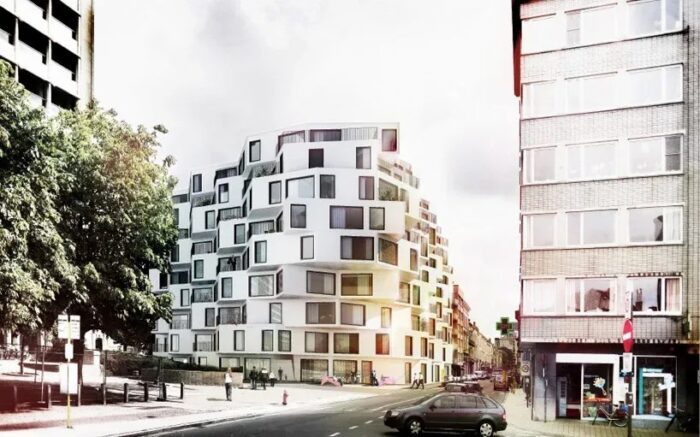 German based firm, JDS, has developed two proposals for an exclusive apartment building located on a prominent corner in the city of Ghent. Given the central location and the current build environment we aim to realize a project that can impulse the whole neighborhood. The building contains 80 luxury apartments who will benefit from plenty of light, air, views and access to outdoor terraces. More details from the architect come after the jump.