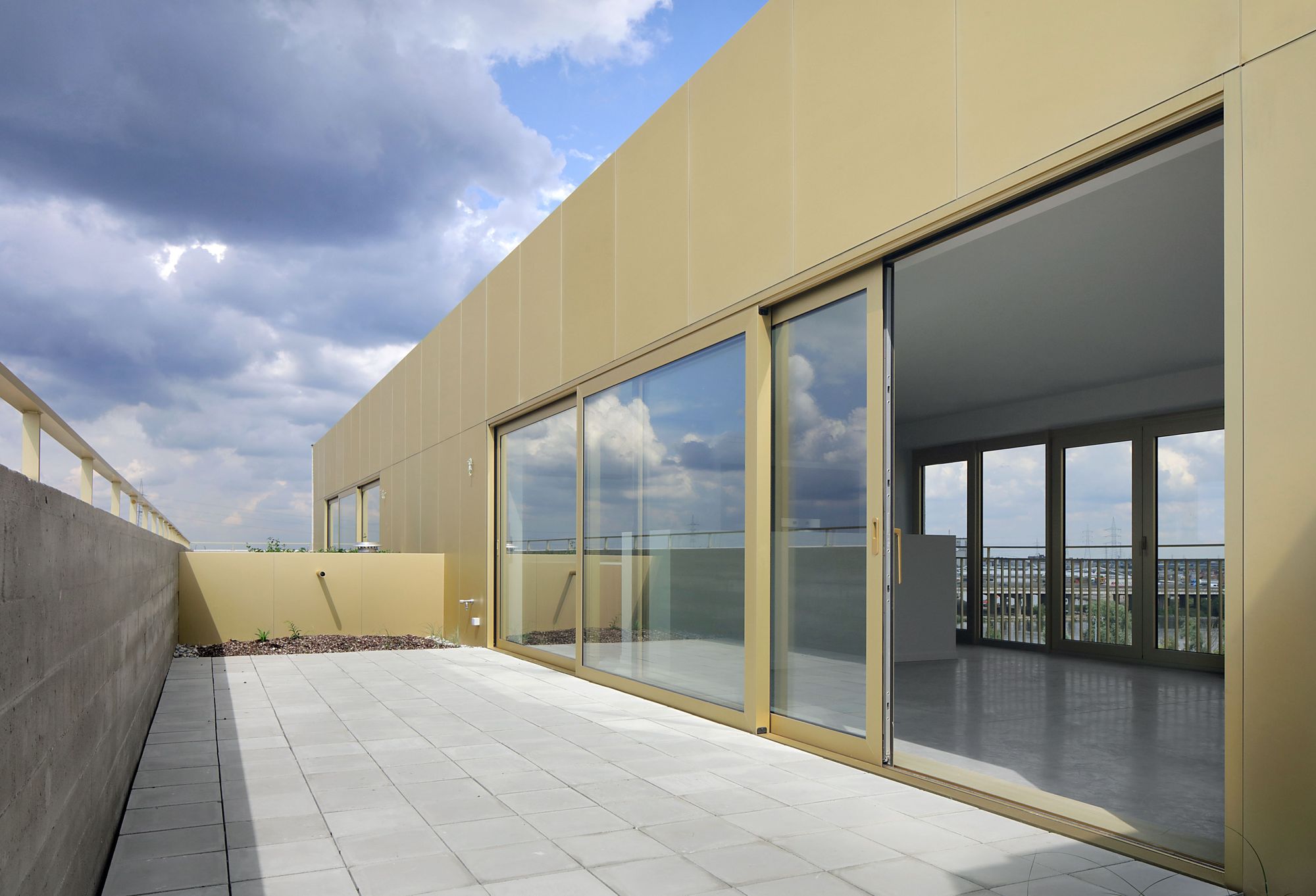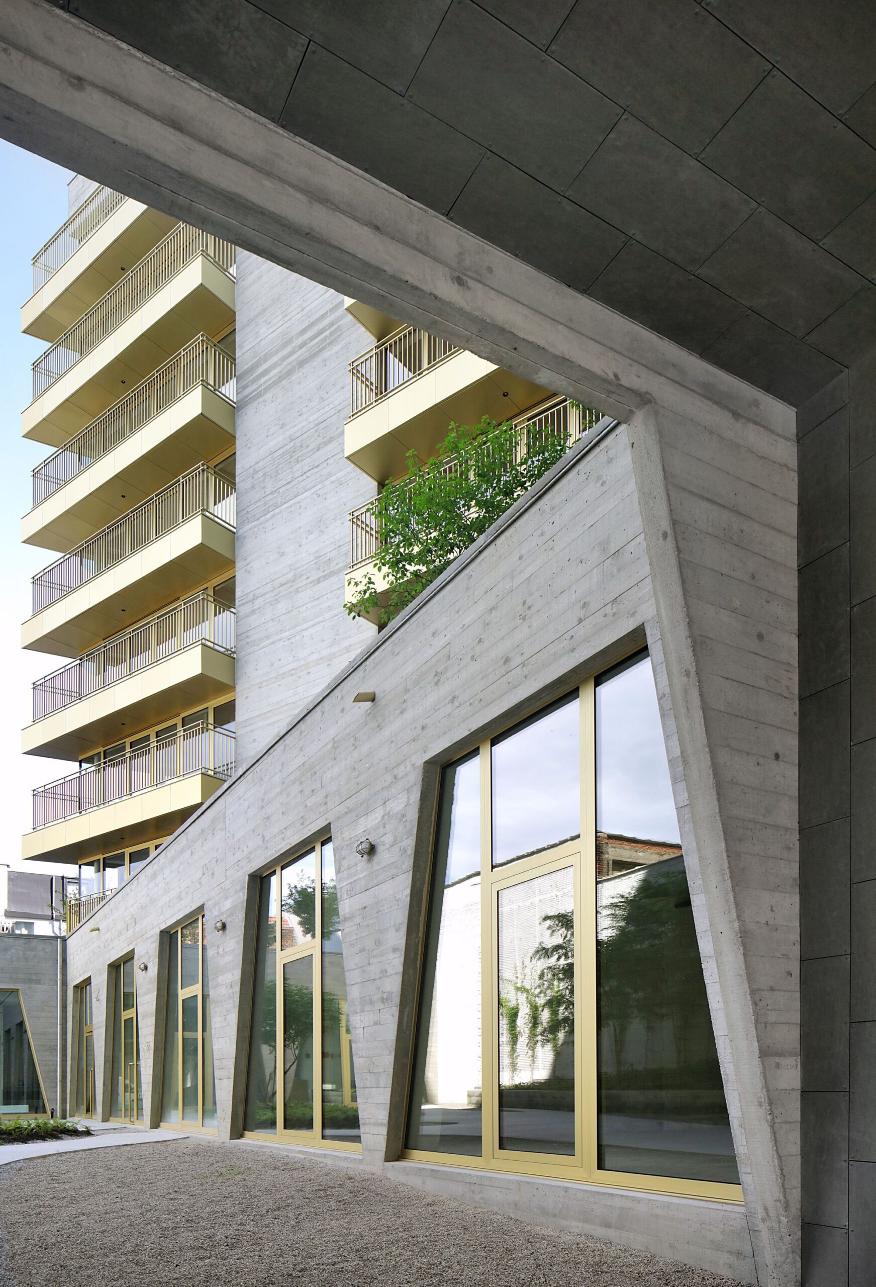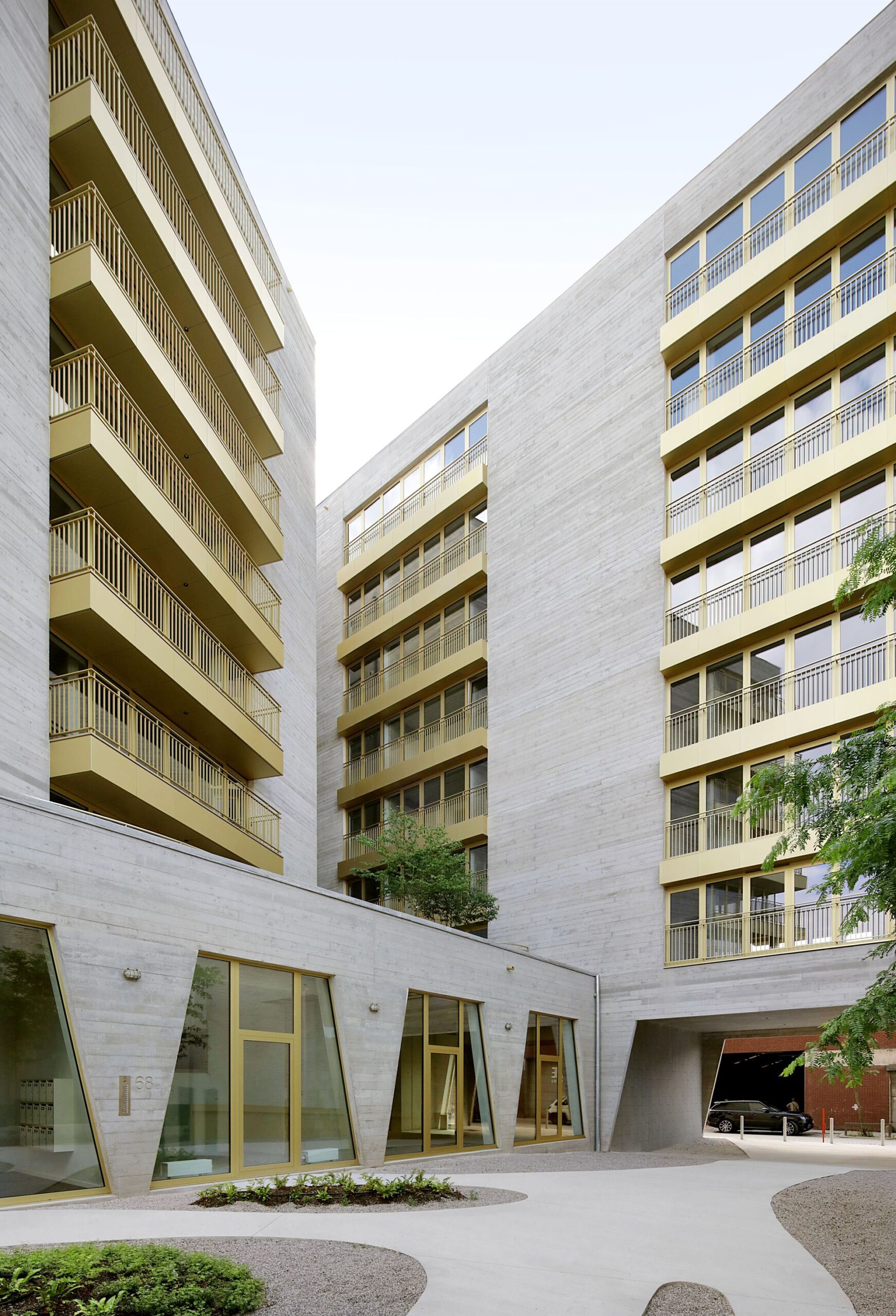The window openings and terraces, which are visibly positioned below each other, create a neutral architecture. Finally, the structure was designed to allow sufficient flexibility for possible future changes in the layout of the flats. Grey concrete finished with gold-coloured terraces and balustrades Each flat has two large windows.