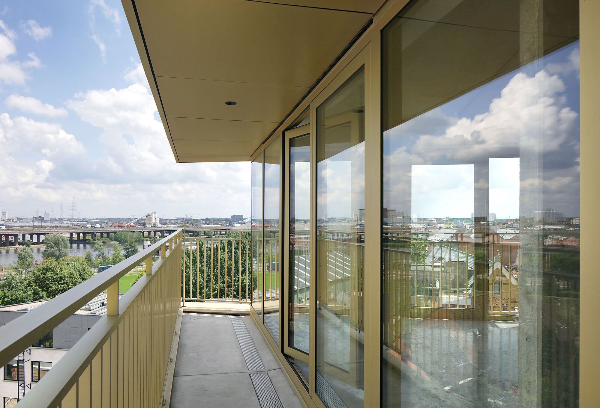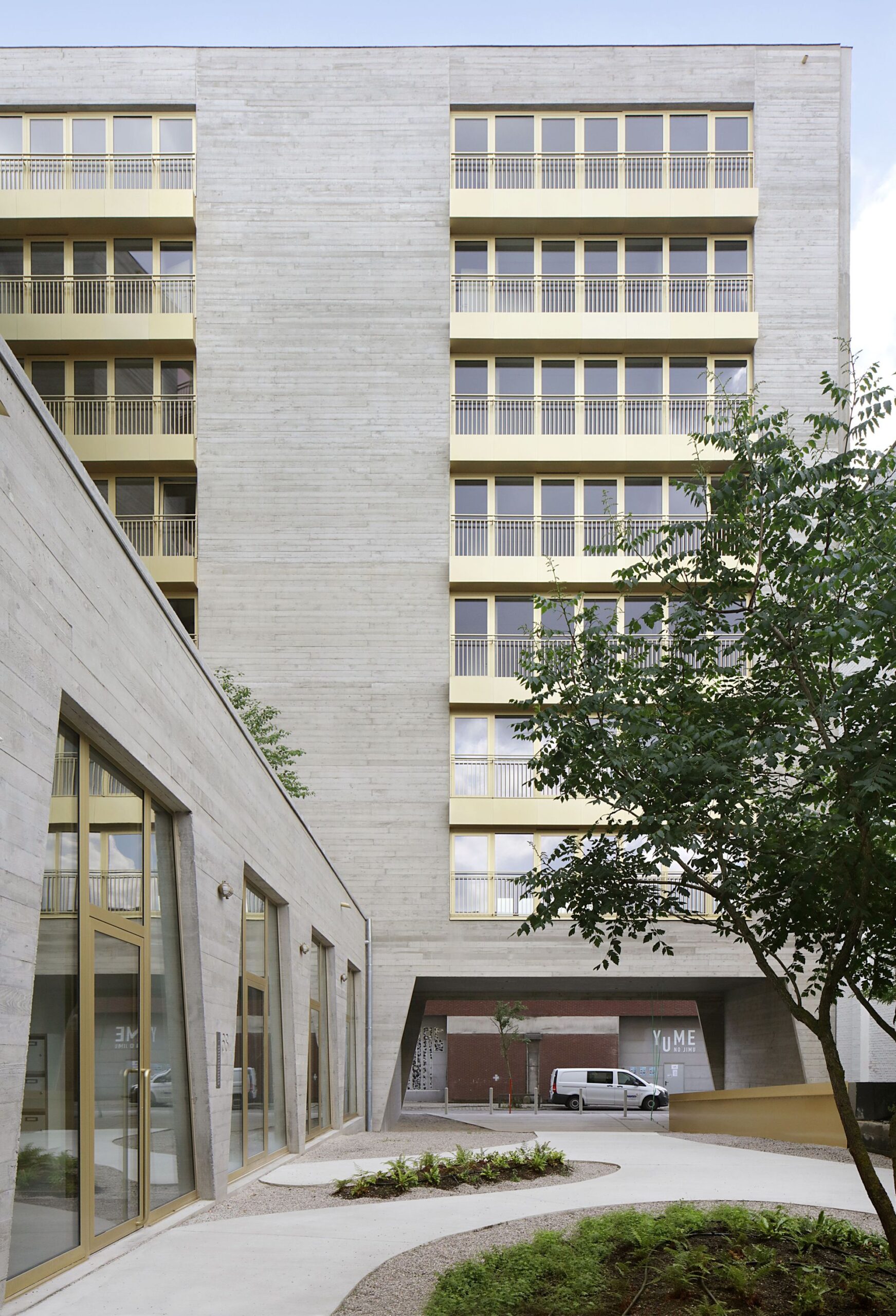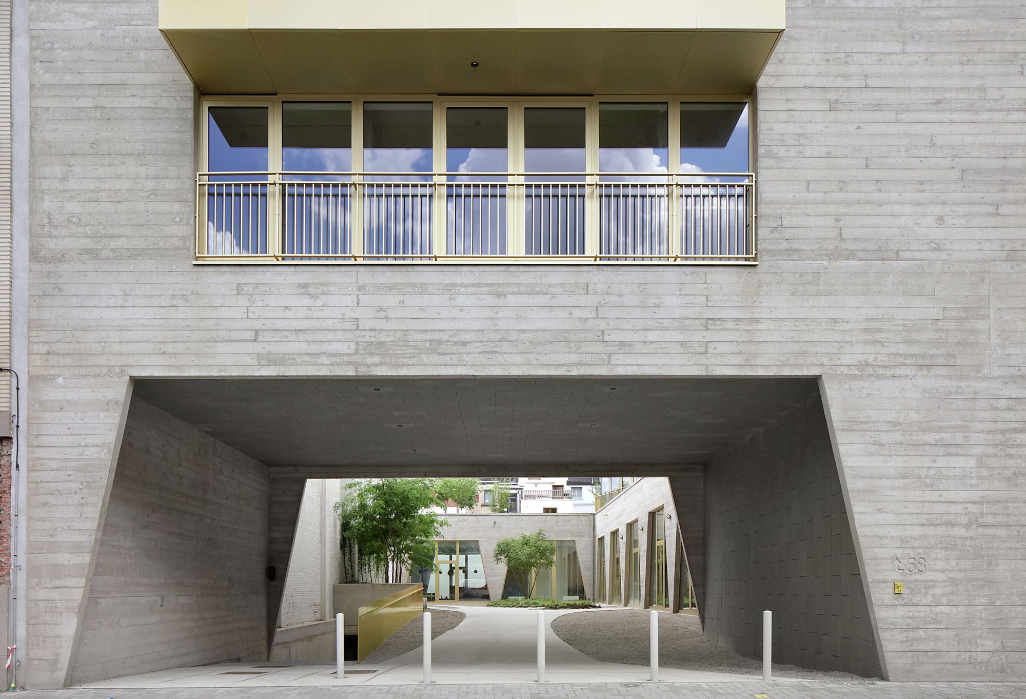 The window openings and terraces, which are visibly positioned below each other, create a neutral architecture. Finally, the structure was designed to allow sufficient flexibility for possible future changes in the layout of the flats. Grey concrete finished with gold-coloured terraces and balustrades Each flat has two large windows.