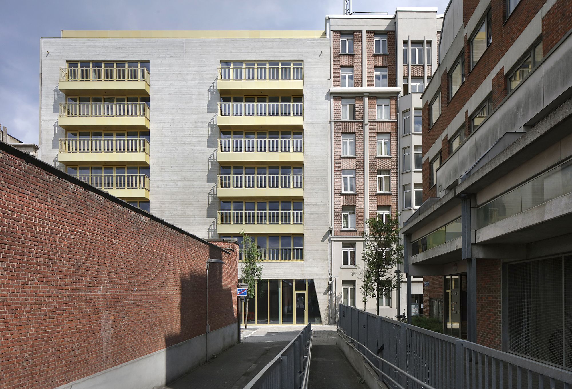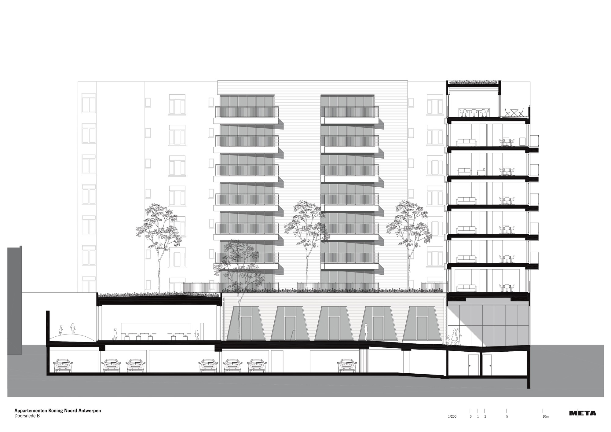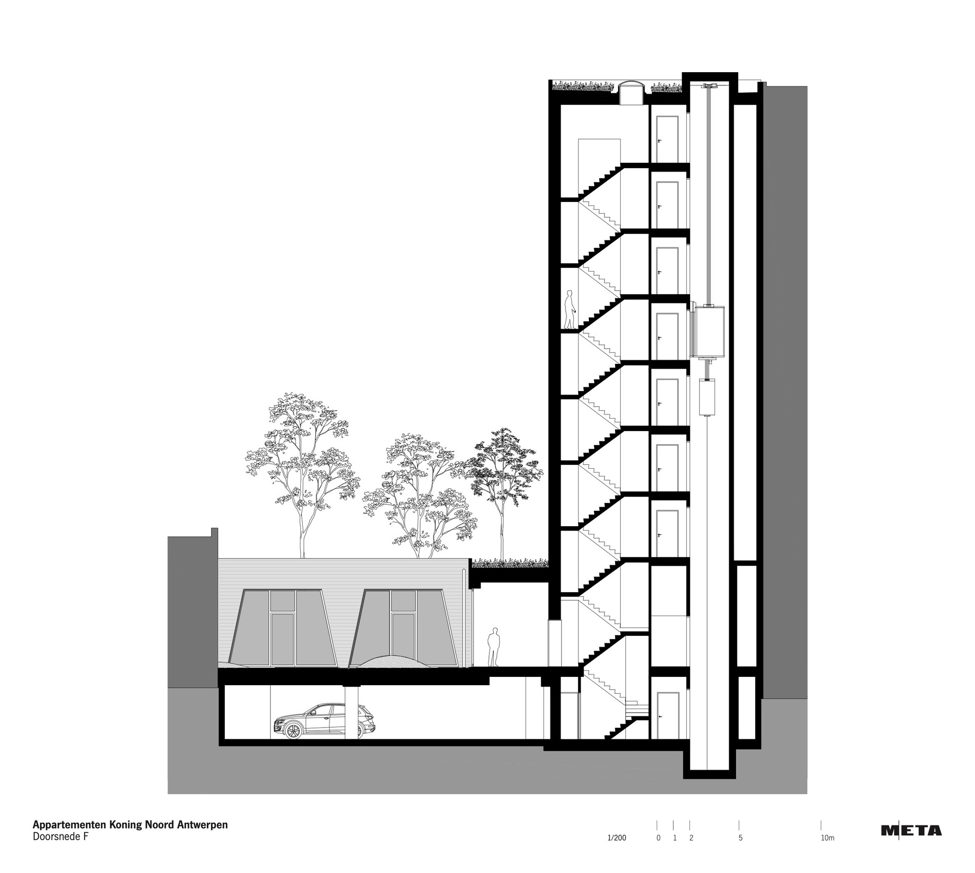 “The idiosyncratic volumetric is the consequence of the exceptional neighbouring buildings. A ground-floor plinth stretches around a collective inner garden and connects both volumes.” – Niklaas Deboutte, META architectuurbureau Typological plan ensures quality and affordability The flats are located in the 2 volumes.