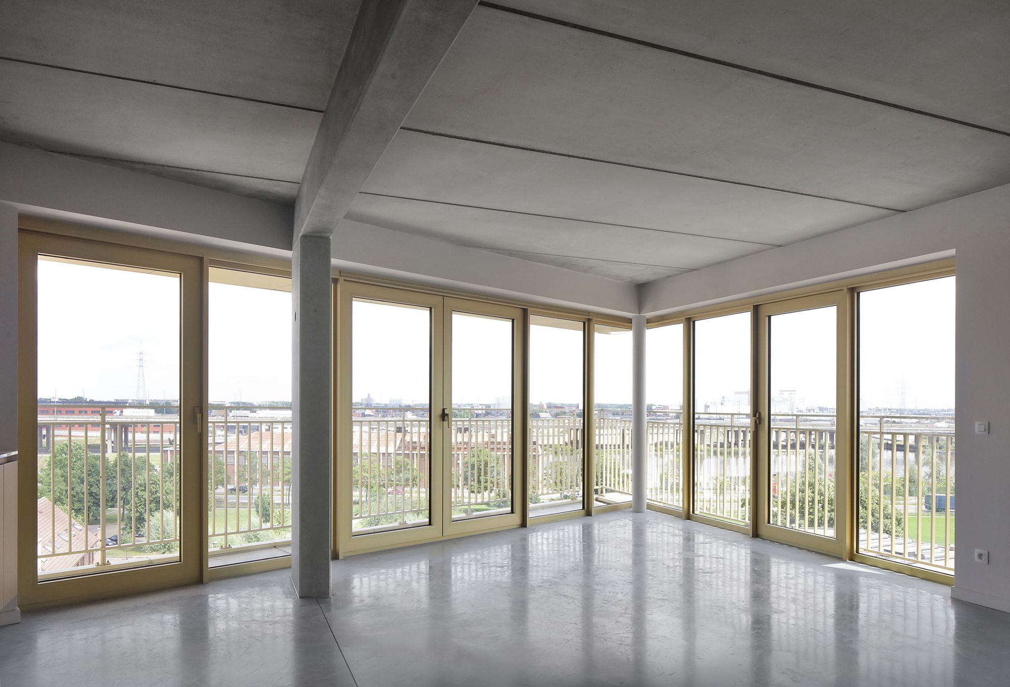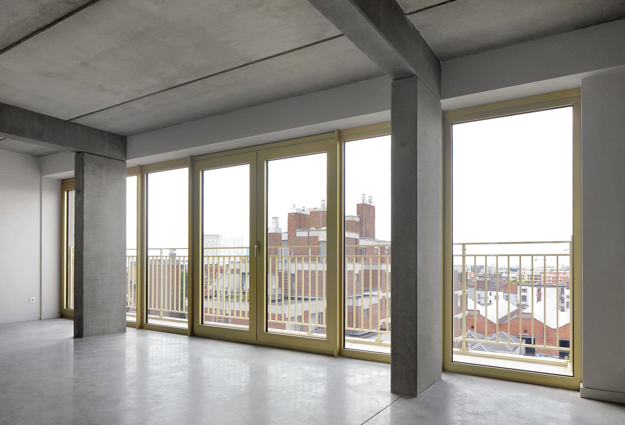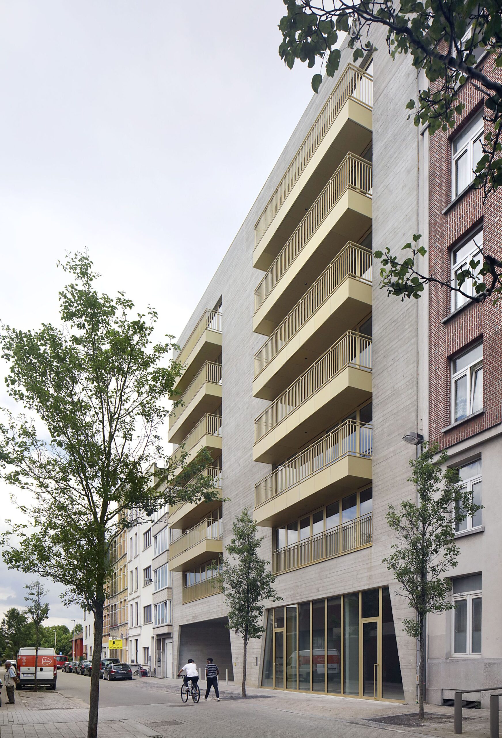 By grouping the open and closed facade surfaces, the concrete could be cast on site using plank formwork – traditionally an expensive construction method – while remaining feasible within the strict financial outlines of this project. The raw, grey concrete is finished with gold-coloured anodised aluminium elements in the terraces, the joinery, the balustrades,.. “The use of concrete with plank formwork makes the project exceptional.