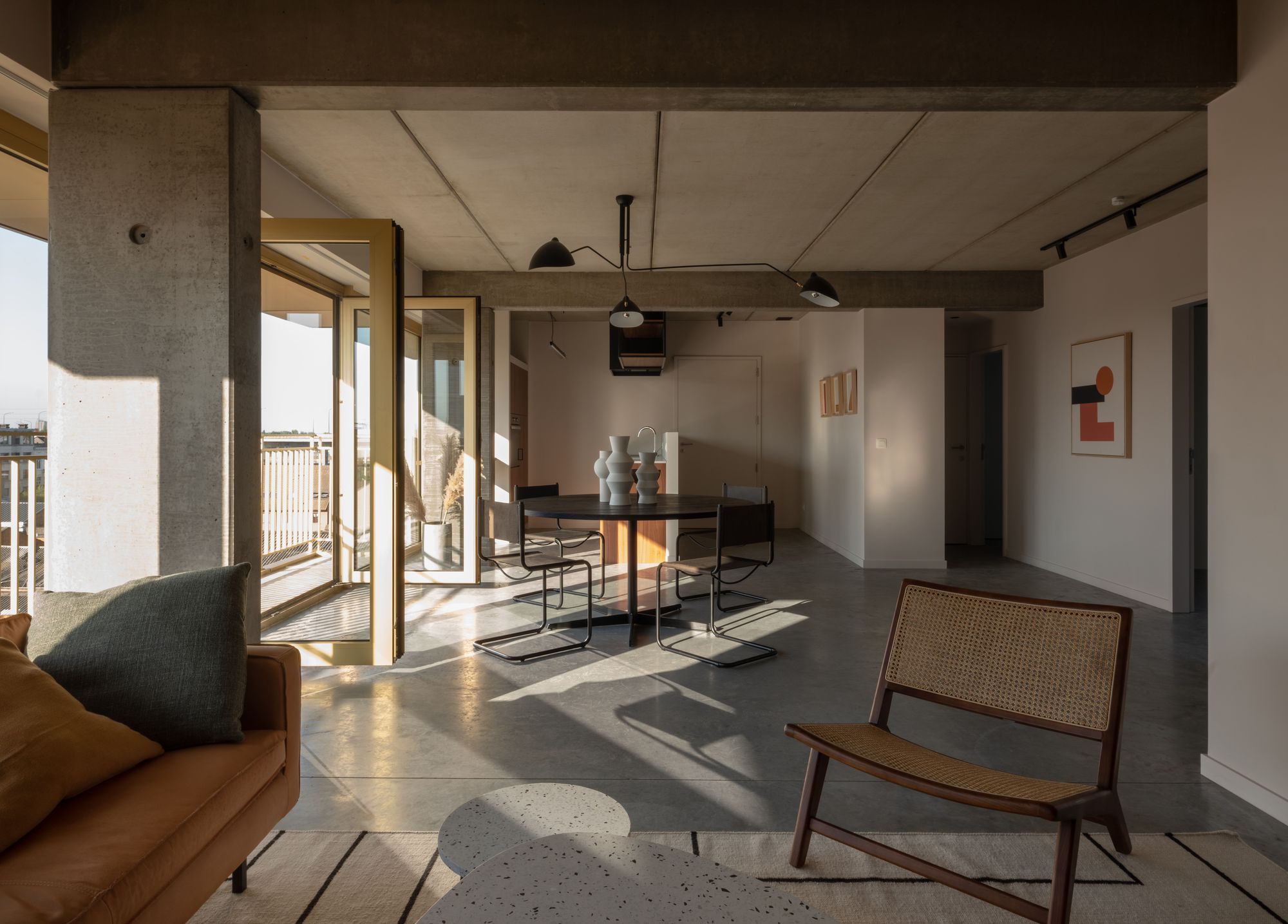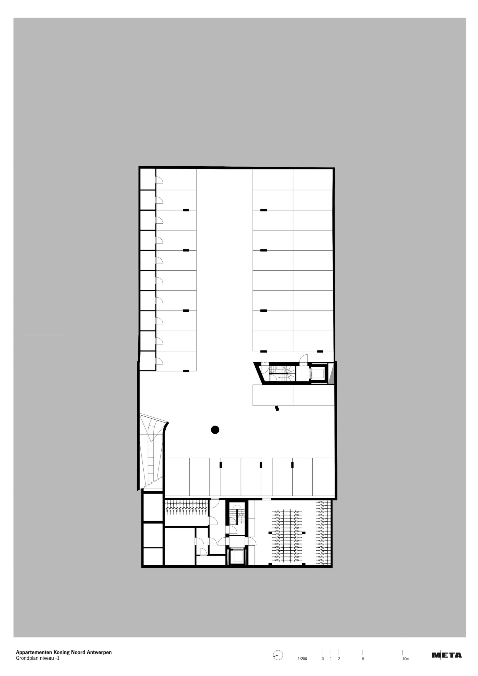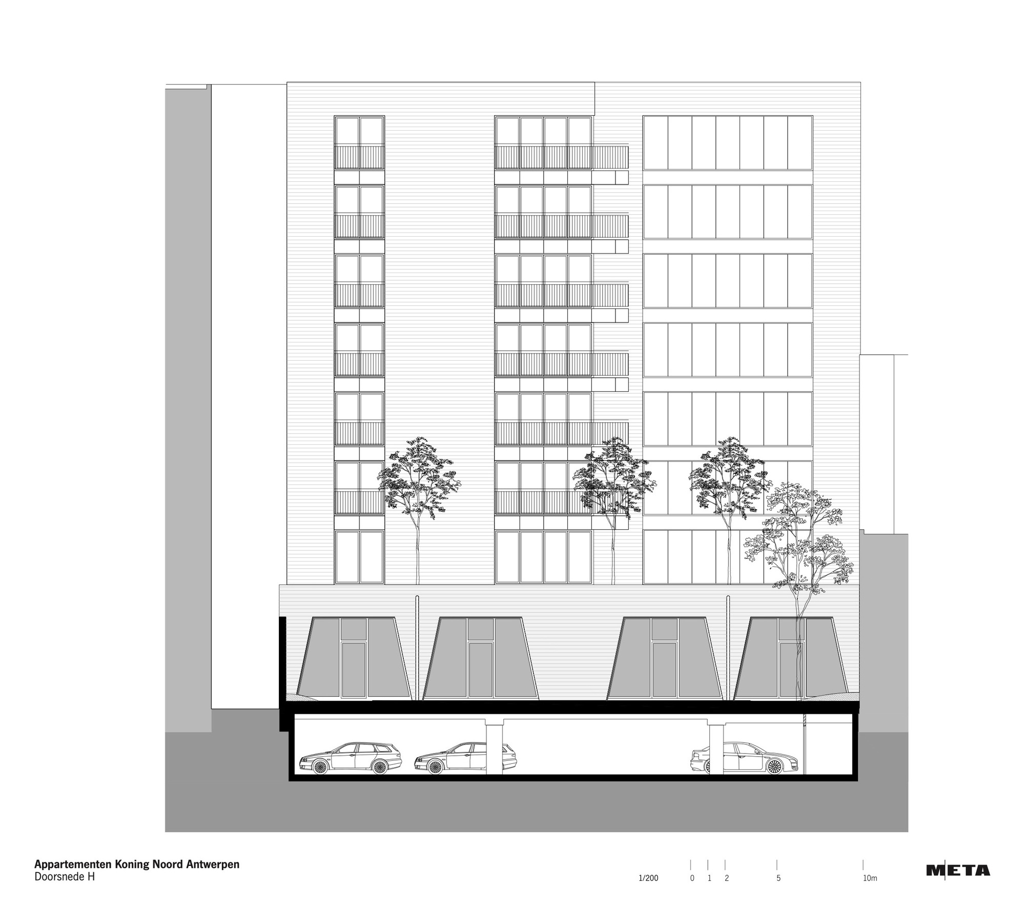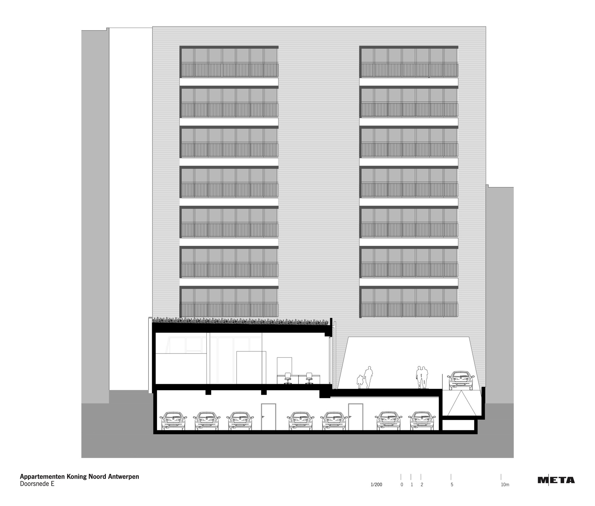 In the Slachthuis district in Antwerp, META has completed the Koning Noord apartment building: a project with 26 houses, a crèche and a workspace. Commissioned by ISTATE, META designed 2 volumes in raw concrete, connected them with a plinth around an inner garden and finished the building with gold-coloured anodised aluminium joinery and balustrades.