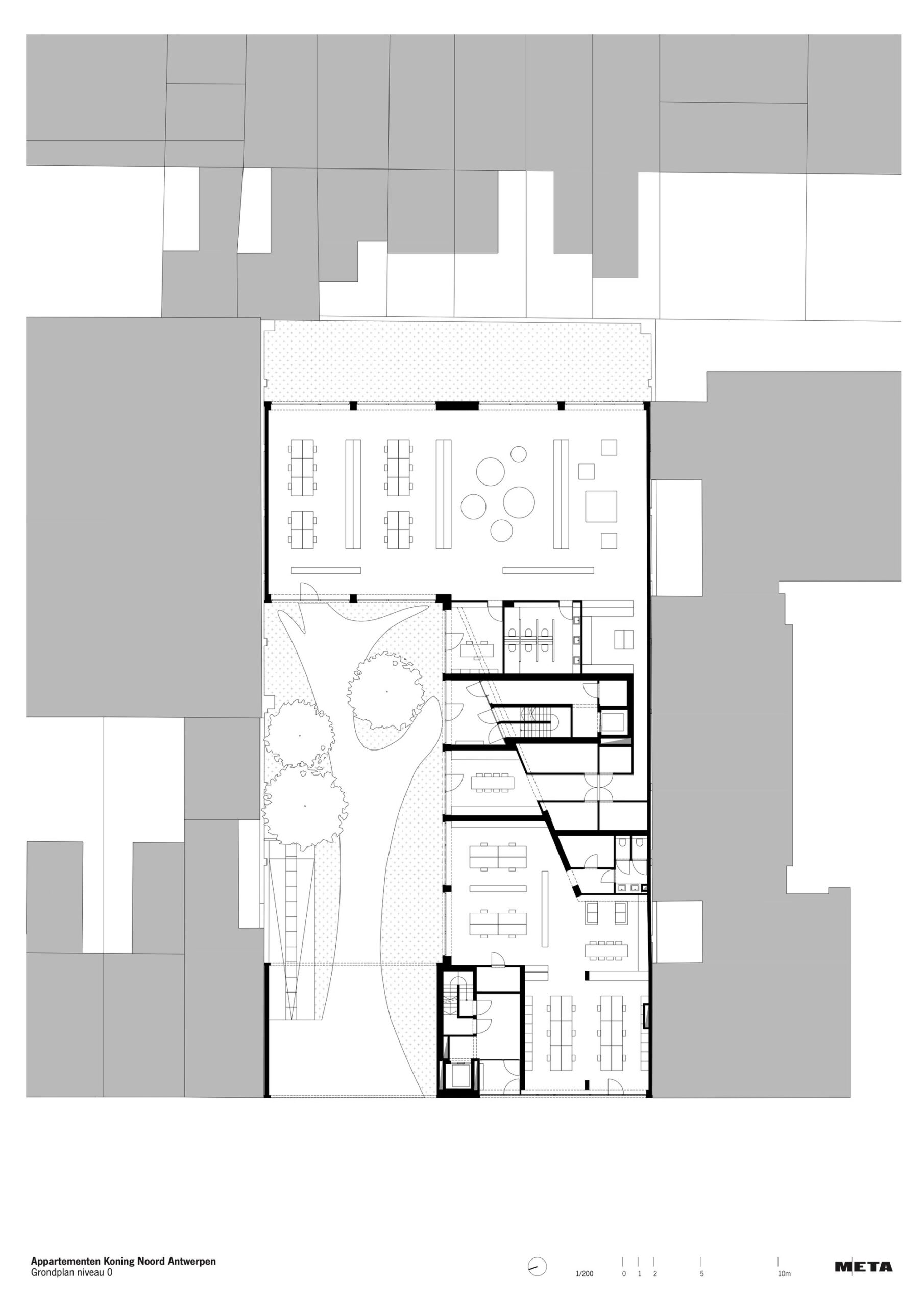 By prioritising rigorous rationality in both concept and execution, META makes room for the design of a generous building. Koning Noord consists of 2 buildings: a volume on the street side that completes the facade row of the Twee Netenstraat and – lying deep on the plot – a second volume that also connects to the adjacent buildings. The 2 volumes are linked on the ground floor by a continuous plinth that folds around the inner garden.