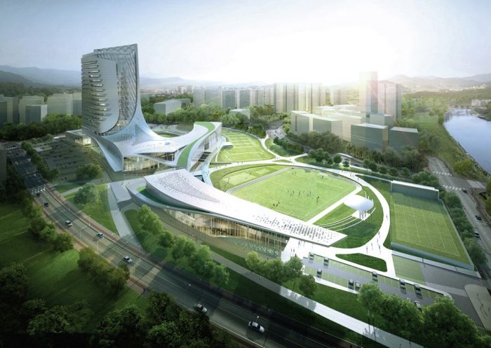 The project, located near a scenic river walk in Jinju, South Korea, integrates public and private program areas (a primary security concern); into a seamless composition that promotes an egalitarian environment. Public sports fields are located south of standing structures to take advantage of sunlight for athletic events and daily use.