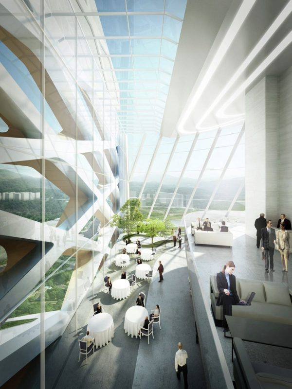 The design concept “Land Meets Sky” reflects LH’s brand by creating a building that is harmonious both visually and technologically with the surrounding landscape. The project implements numerous sustainable methodologies at both the micro and macro scale. Features include a dramatic brise soleil on the southern façade of the tower and multi-storey interactive zones on the west that utilize an intelligent skin that draws cool air through the building.