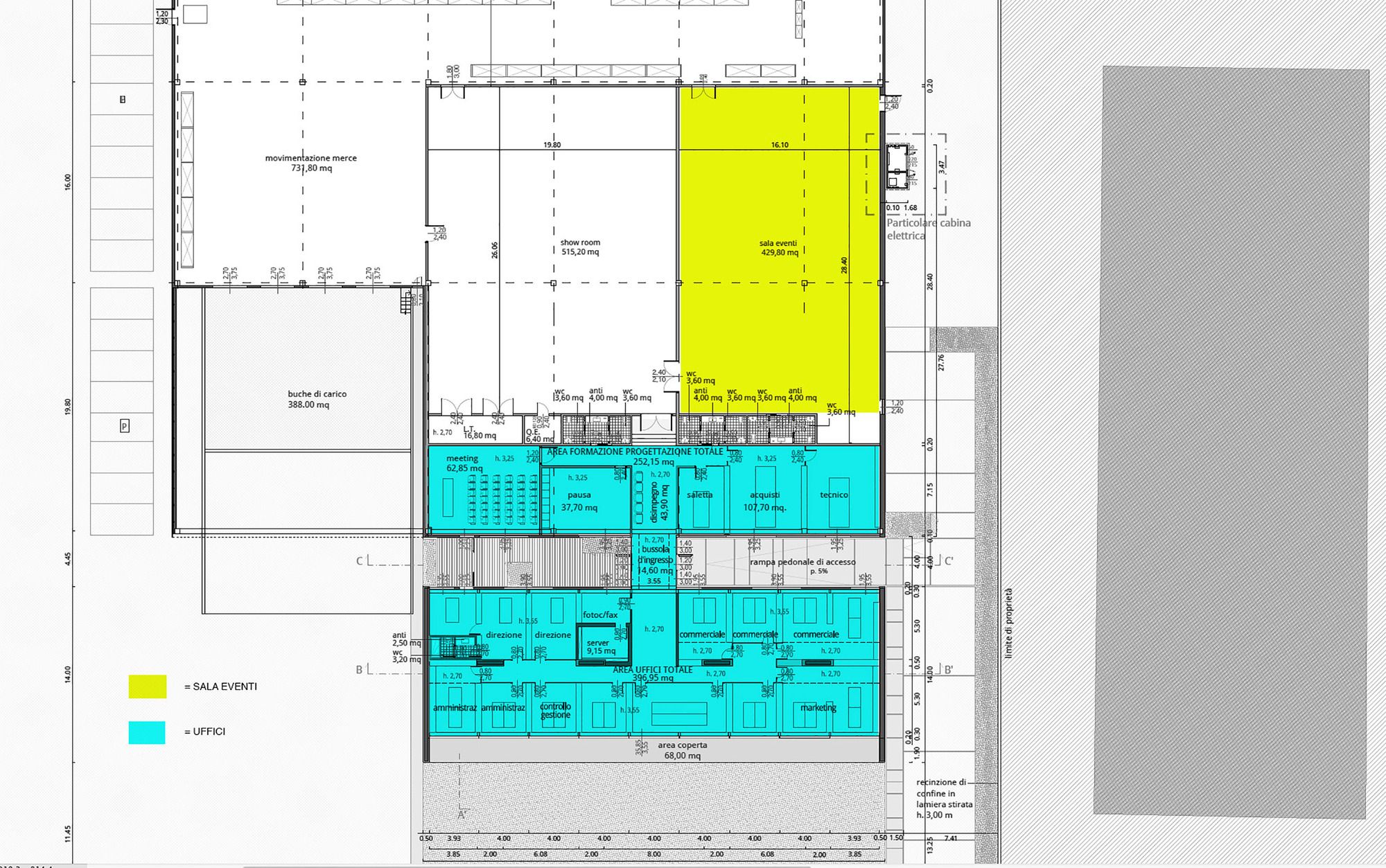 Our premises will have an area dedicated to offices and to production, the loading, and unloading of goods, as well as a recreational area for sport and entertainment, music, food, a spacious showroom open to the public and an area for hosting partnerships of an artistic nature.