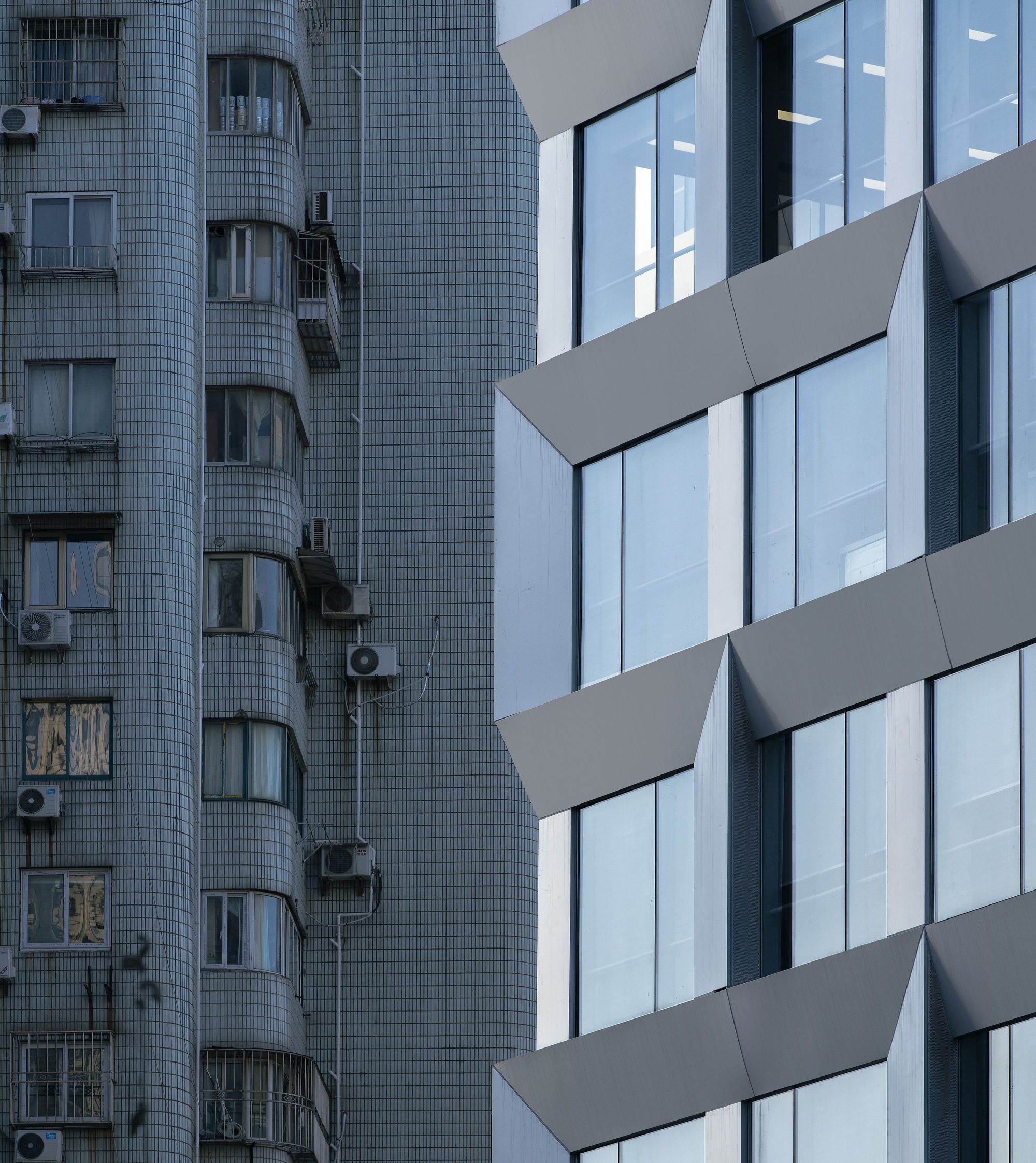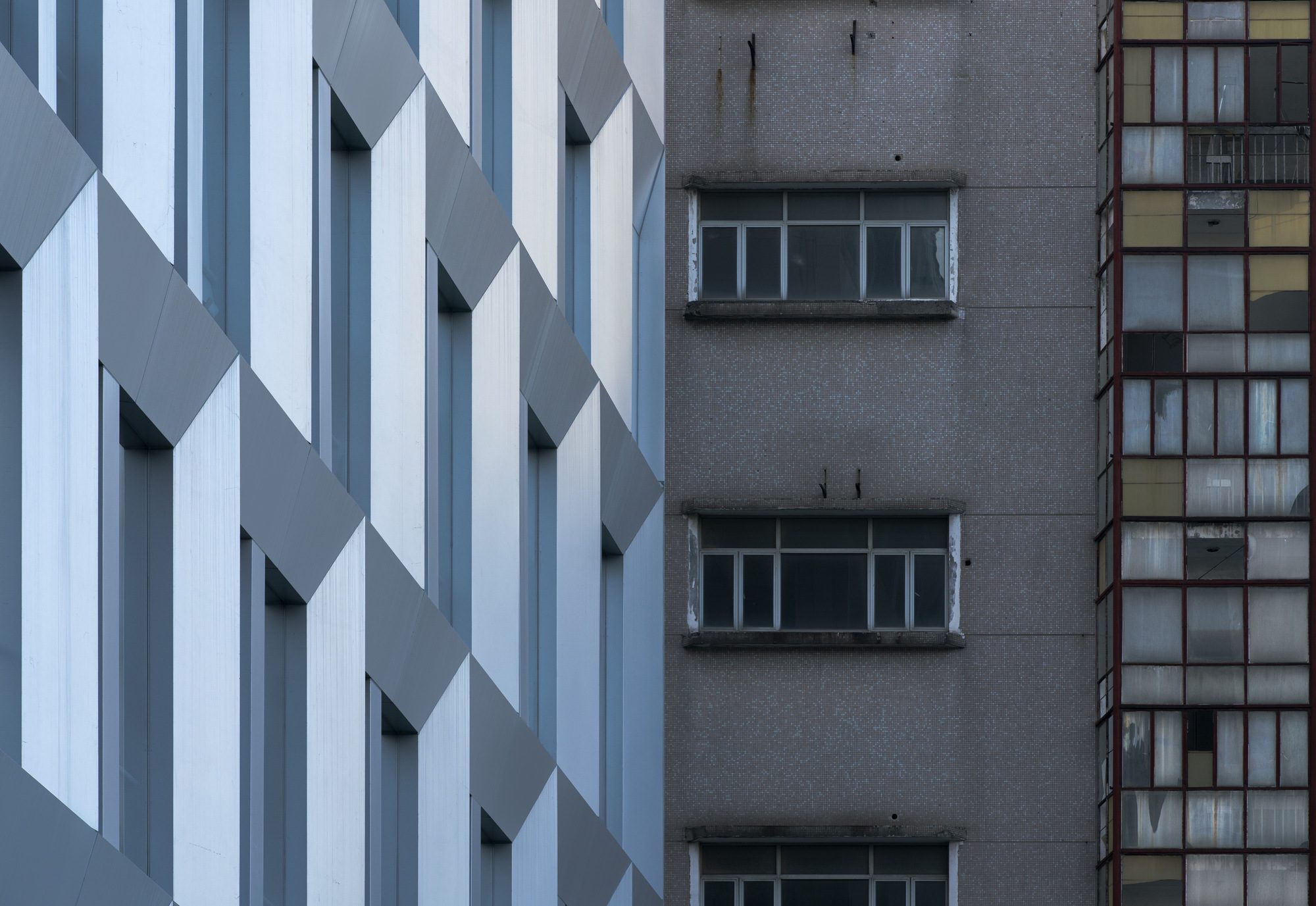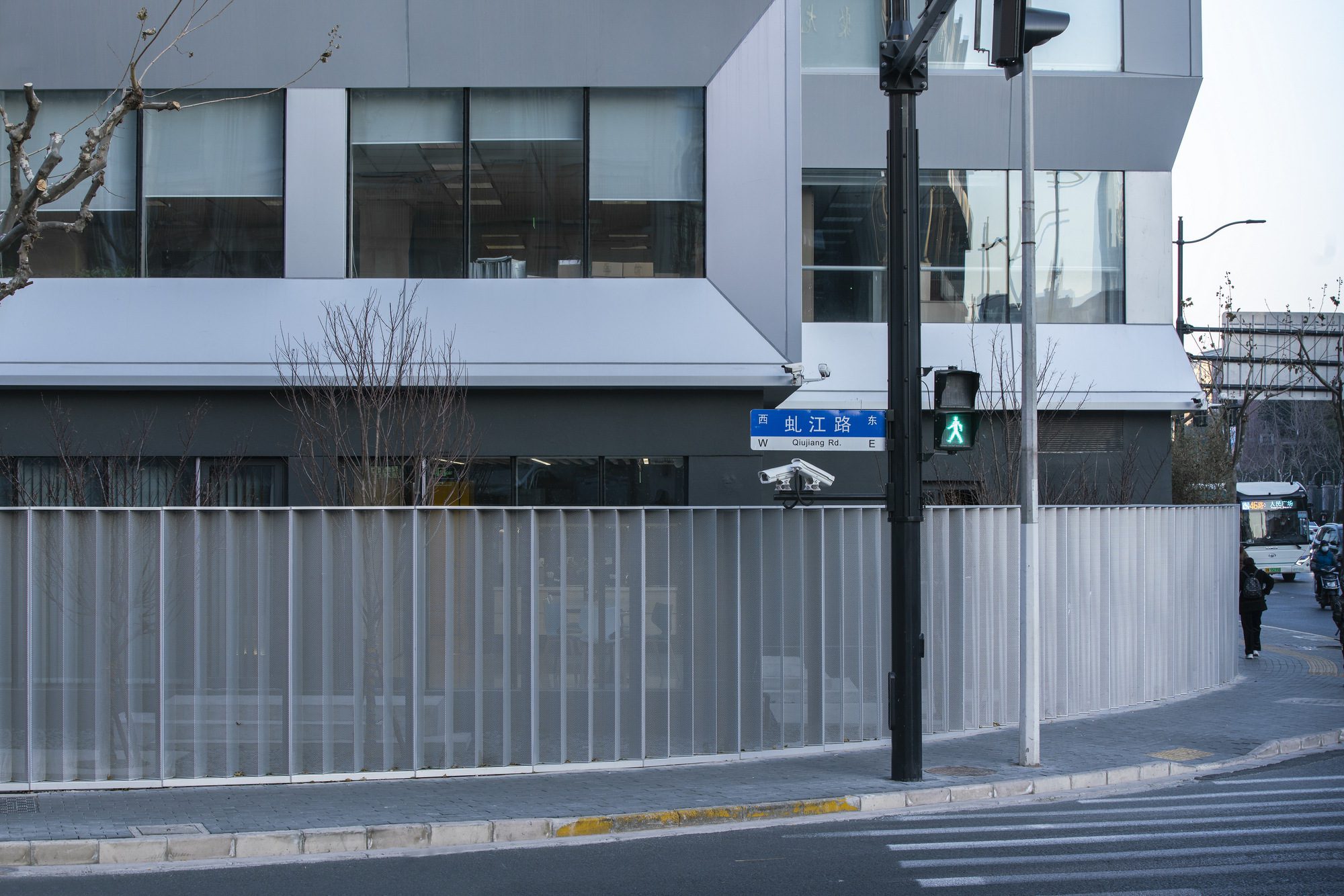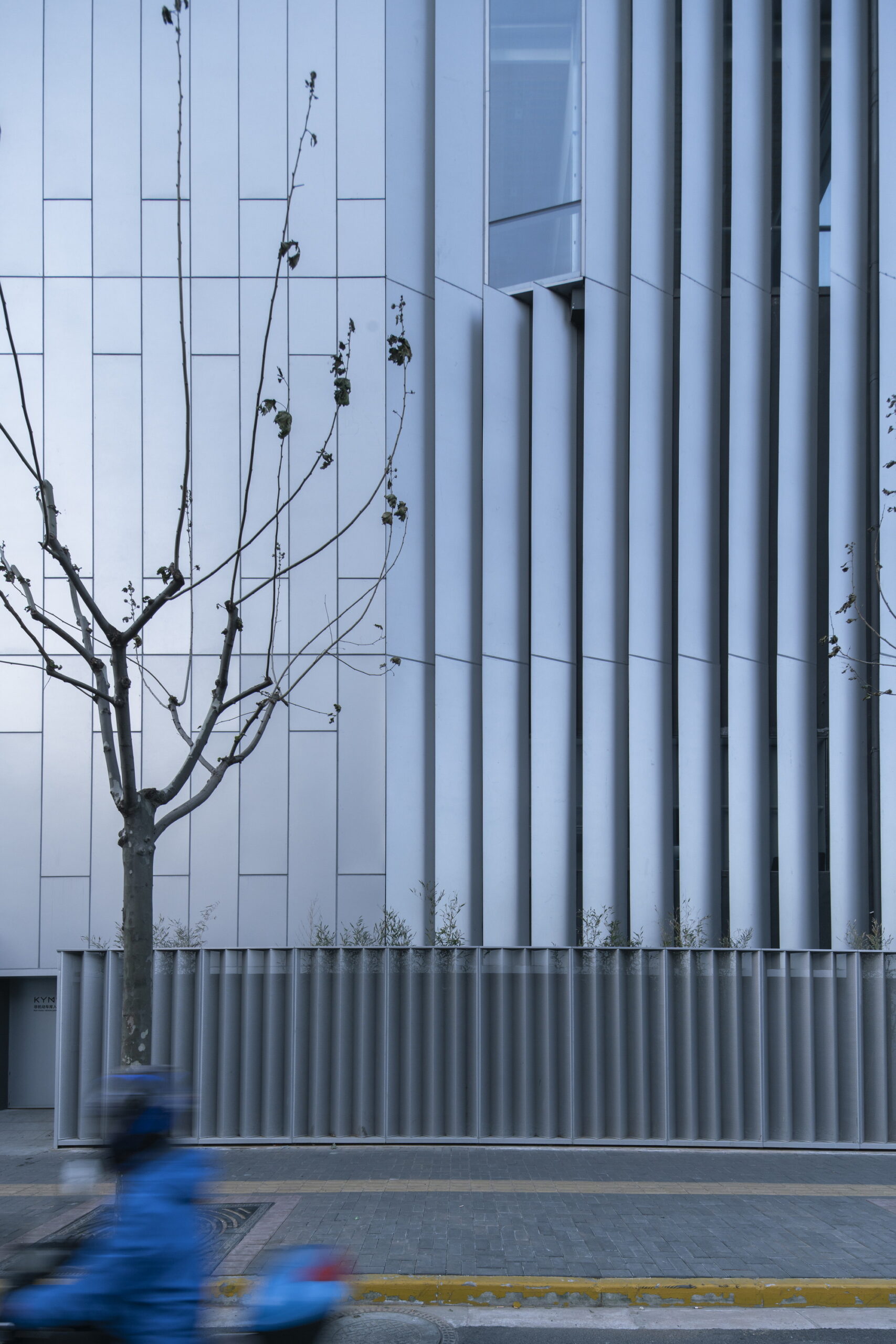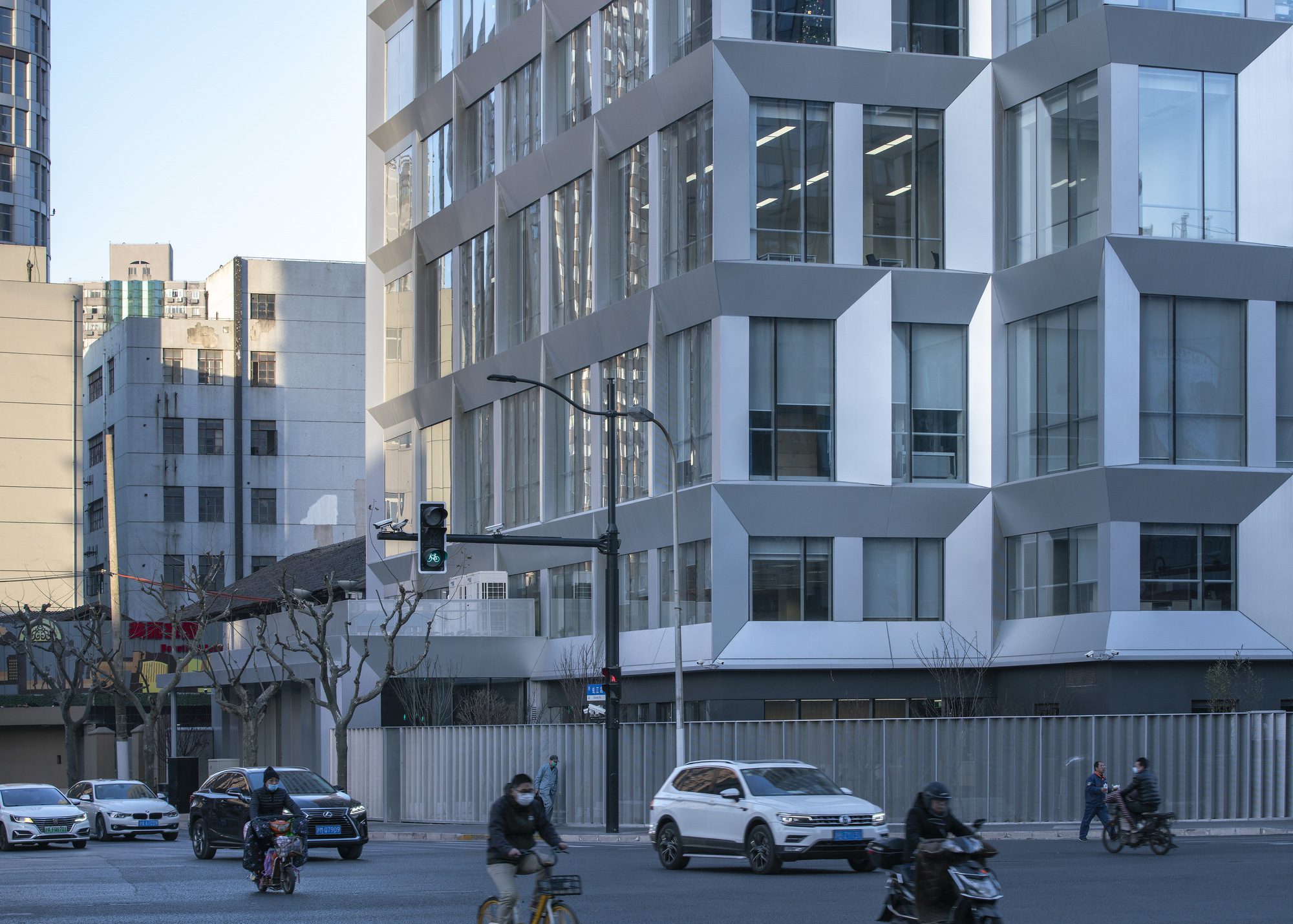 We have preserved the existing floors and structures for the street elevation. When guaranteeing the fire safety, floor-to-ceiling window systems were used to fill the framework. The large glass façade is mostly kept integrity, only covering the side openings with perforated panels. The aluminum curtain wall features rhythmic concave-convex patterns on main window piers, while adopting smooth surface on the large gable walls, with limited variations. Bathing in the sunlight, this silver curtain wall looks like a flowing metallic cloak, distinguishing the building from its surroundings.