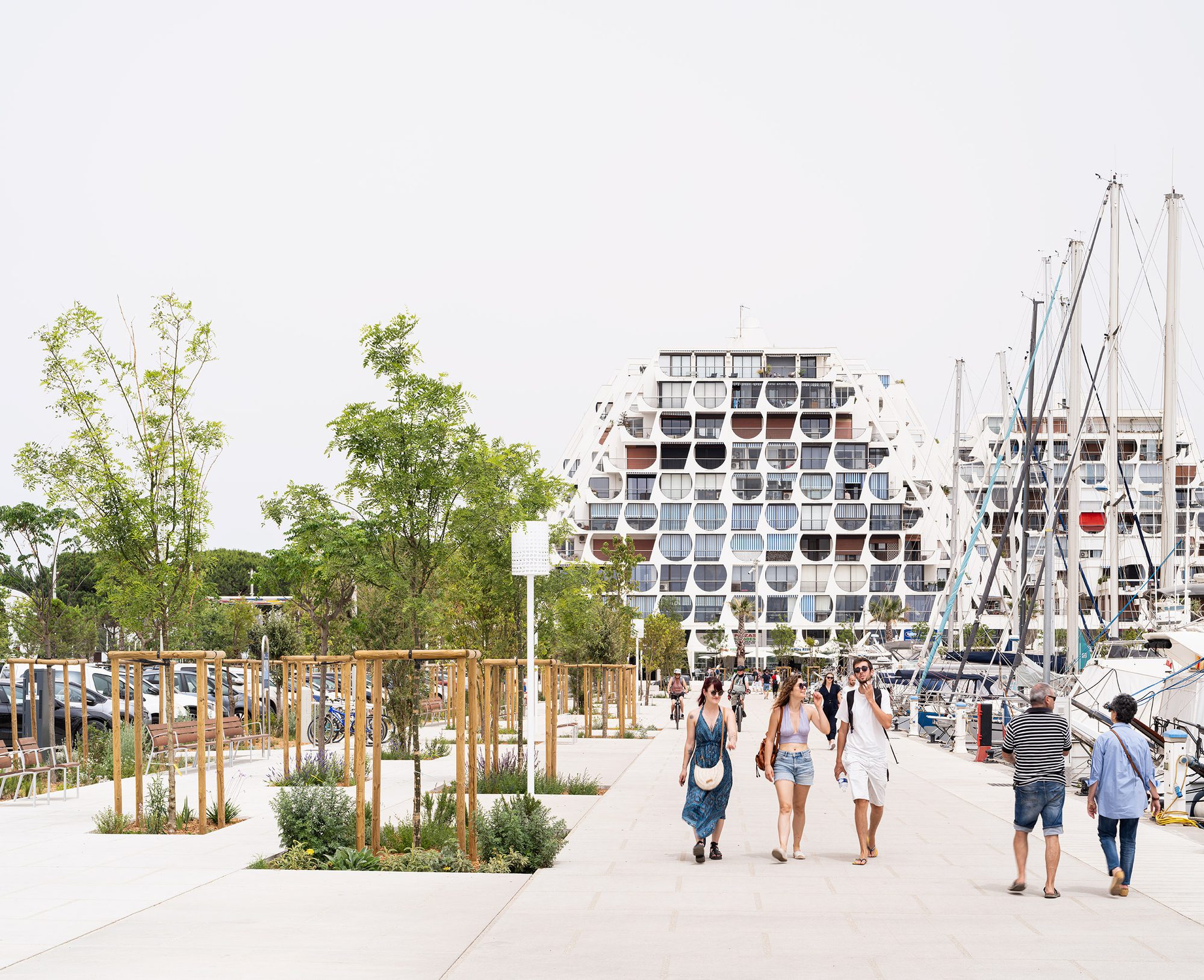 La Grande Motte is an outdoor city. Its vibrant local life is reflected in the intense use of public spaces. The port promenade is the backbone of this vitality, serving as a hub for movement, socializing, commerce, and festivity. The docks are organized with a dual logic of promenades and plazas, accommodating the seasonality and lifestyle of boaters. The entire pedestrian and cycling area is designed to handle intense flows and uses, especially during the summer. A 1.5-kilometer promenade, with a 7-meter wide quay freeboard doubled with a tree-lined overwidth, connects beach to beach, circling the port. In addition to the installation of urban furniture that aligns with this ambition, the requalification of Pompidou docks extended to the façades. To restore visibility to the iconic architecture of the seaside resort, the Leclercq agency designed new glass extensions for the ground-floor shops, expanded the terraces, and worked on the continuity of the paving up to the port basins.