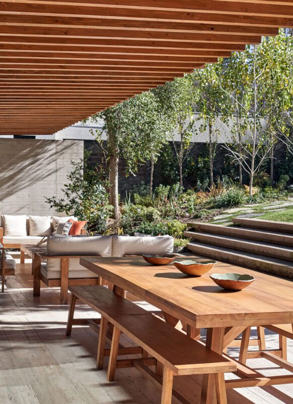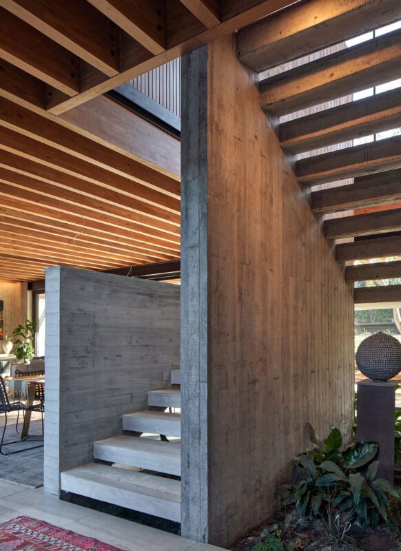 A platform made of laminated wooden beams spaced every 40 cm supports the second floor, creating a texture inside that enhances and warms the space, while also configuring an eave to the north that shades the main terrace in summer but allows sunlight to enter in winter.