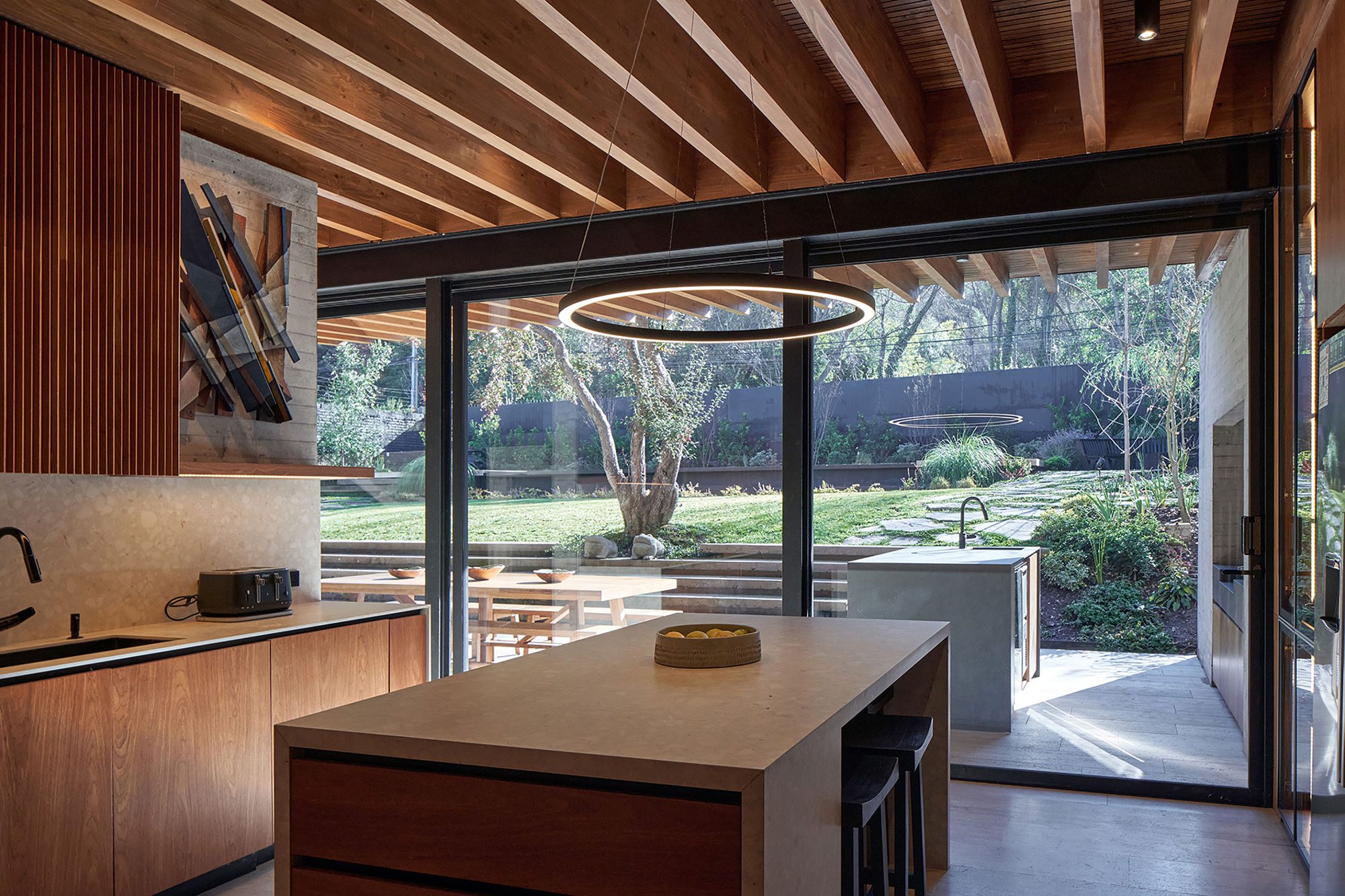 The house was separated from its southern limit to create an access patio from the parking areas and another patio along the dining room, living room, and master bedroom, reinforcing the effect of being in the middle of the garden, as the house has complete transparency in the north-south direction.