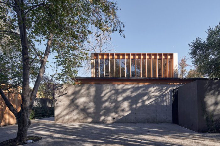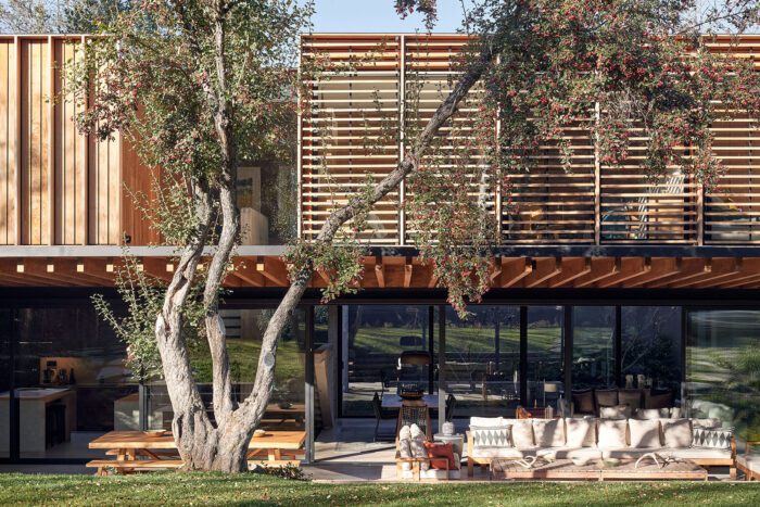The volume of the second level is made up of lightweight panels covered with a ventilated skin of thermally treated wood, and the openings have wooden slats of the same material, providing protection against the strong summer sun.