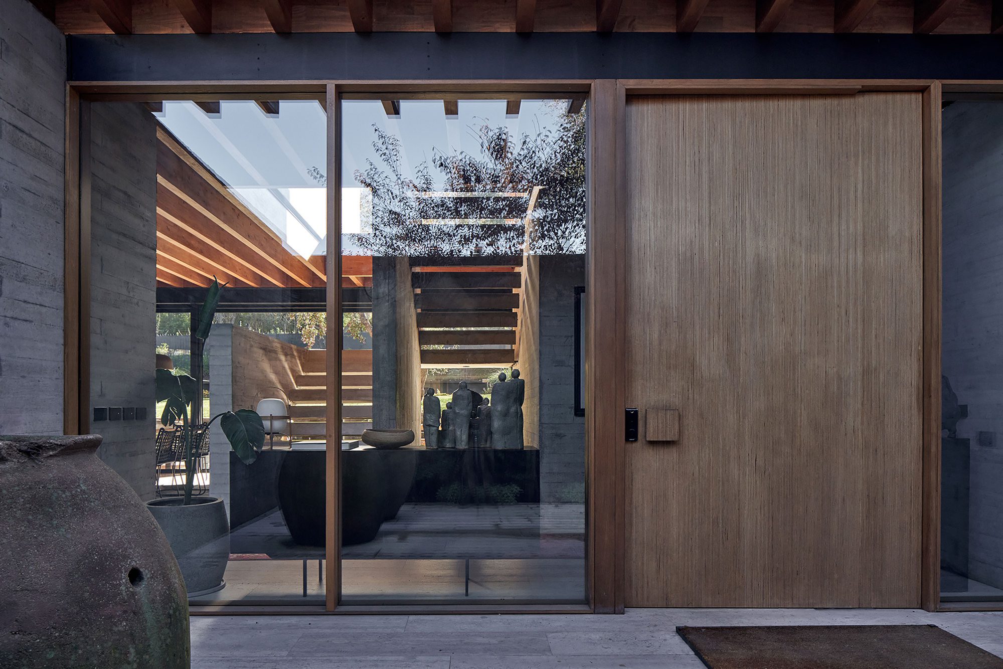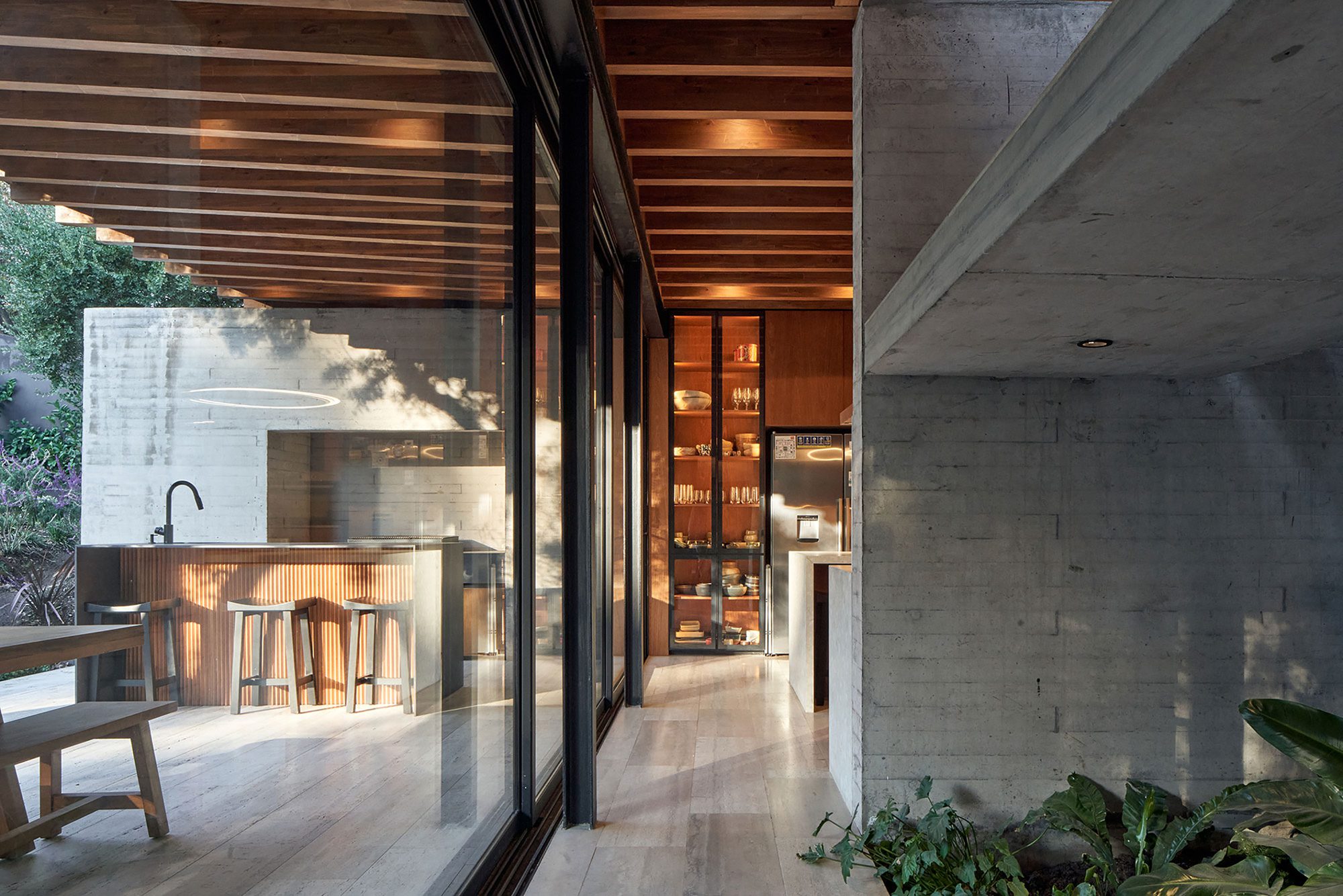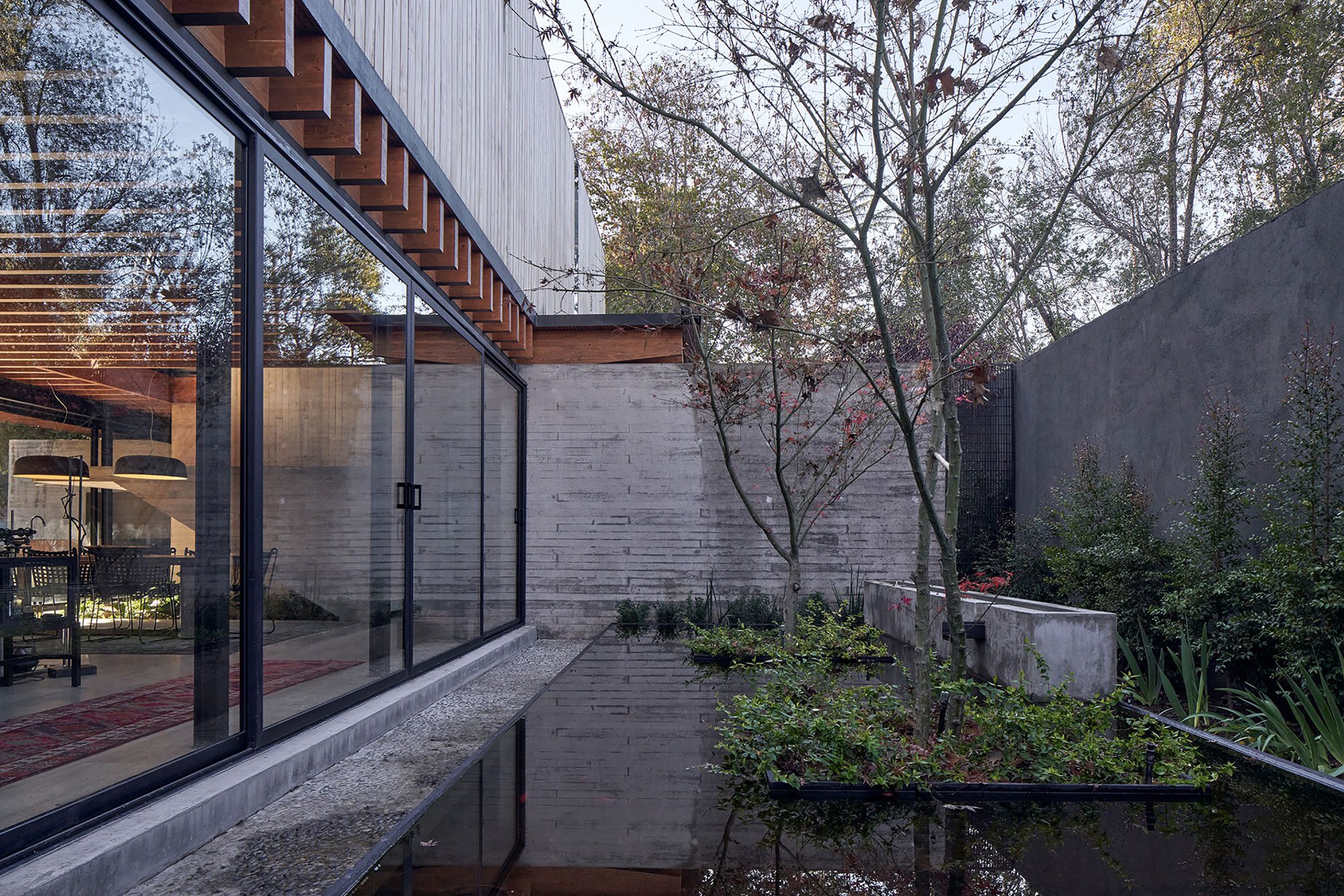 In this last patio, a water basin was incorporated, which, thanks to the prevailing south wind in the summer that is accelerated as it passes through the house due to the Venturi effect, helps cool the interior when the sliding windows on both facades are opened.