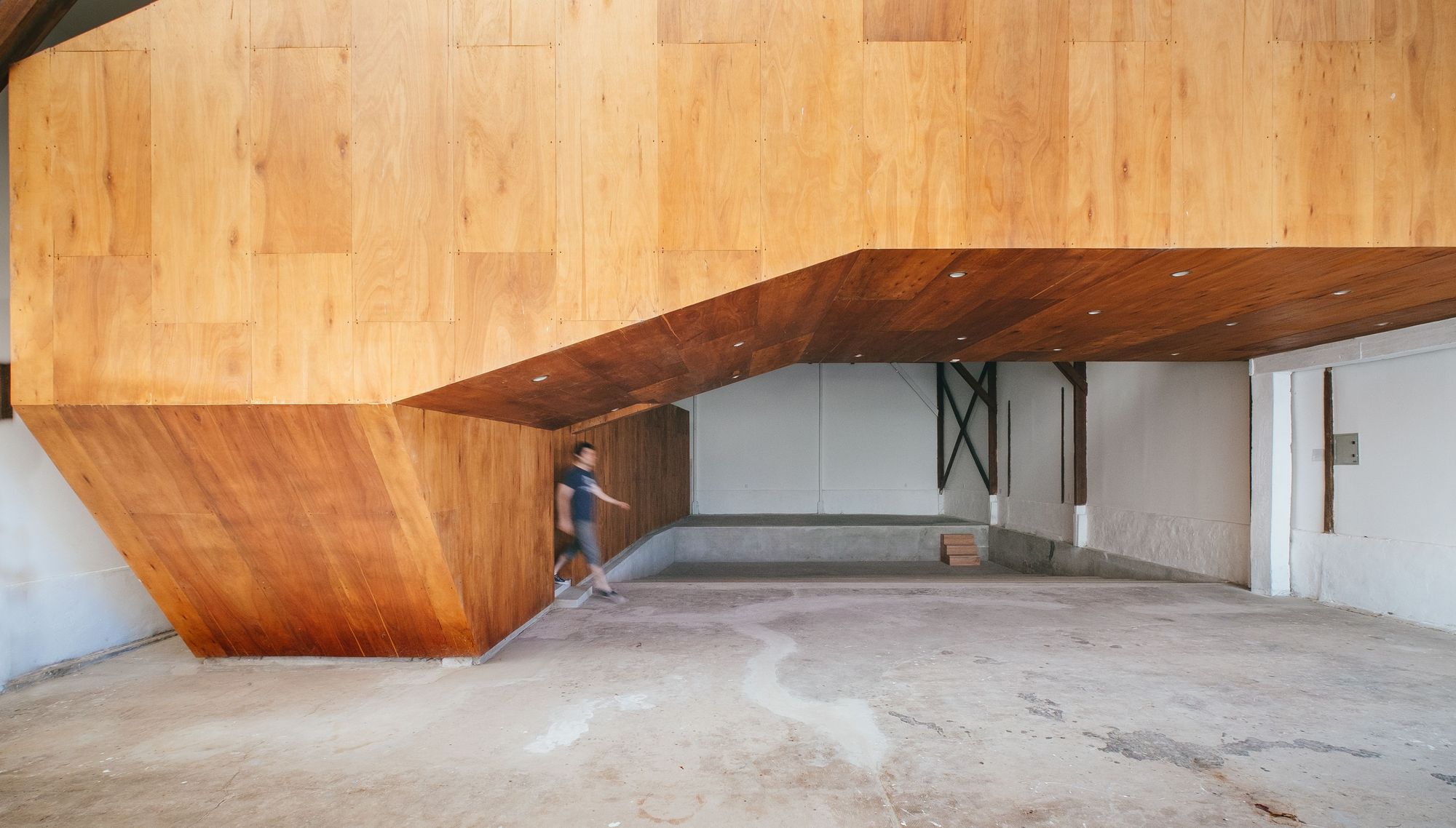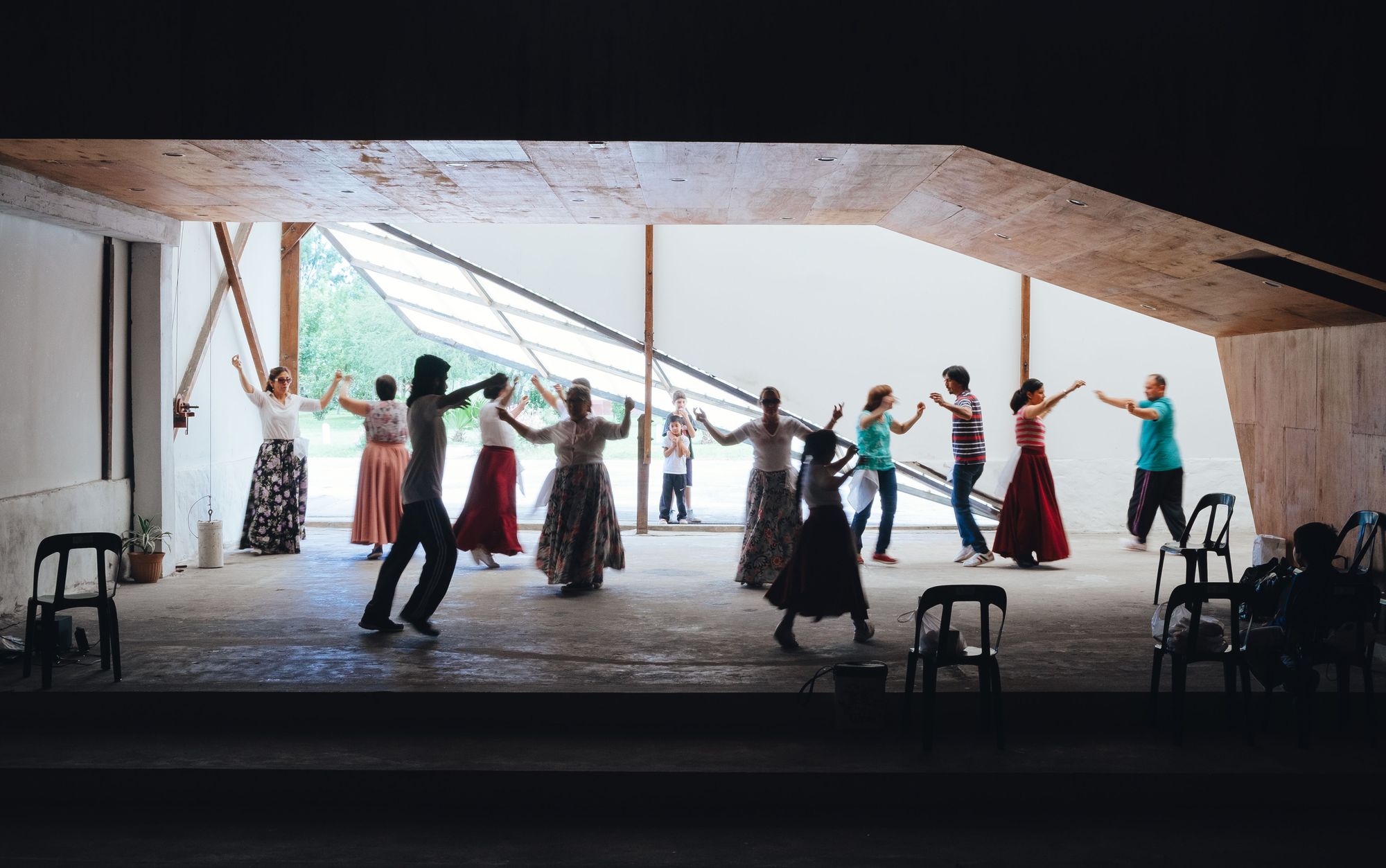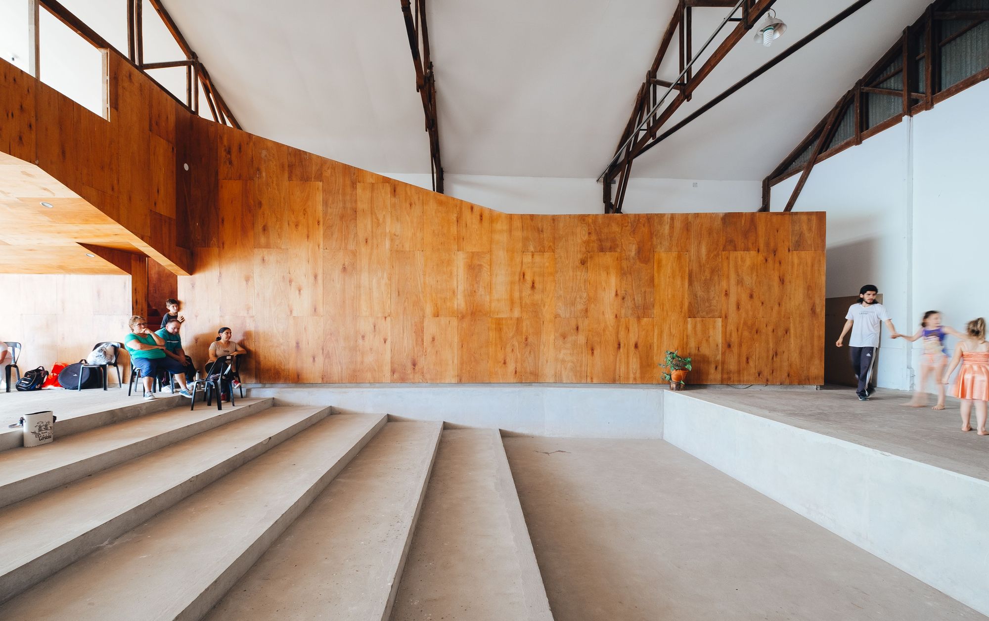 Because of the budget limitations and the production conditions already mentioned, it was decided to restrict the diversity of work items and guilds and concentrate resources on the execution of two fundamental operations. On one hand, a kind of habitable wooden furniture, executed by the work team of the community carpenter, whose materialization replicates in scale the assembly procedures of frame and veneer furniture, which were booming in our country in the ’80s. Its layout, embracing the auditorium room, makes it possible to clearly define the distribution of the program in a new inside condition, containing the sanitary core and dressing rooms, and an upper floor that functions as a classroom/workshop or acts as an auditorium to increase its capacity. In the remaining space, in the ‘between’, the programs with the highest influx of public are developed, the rehearsal room/exhibitions and the room/auditorium itself.