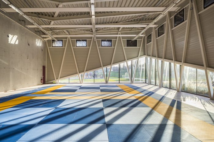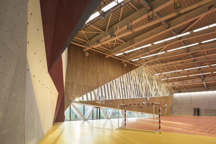 The sports center is structured by a play of transparencies and visual vents, which fudge the borders between the outside and the inside where surrounding nature is ever-present. The openings are framed and highlight remarkable elements on inside and out. The orientations are selected for the sporting activity.