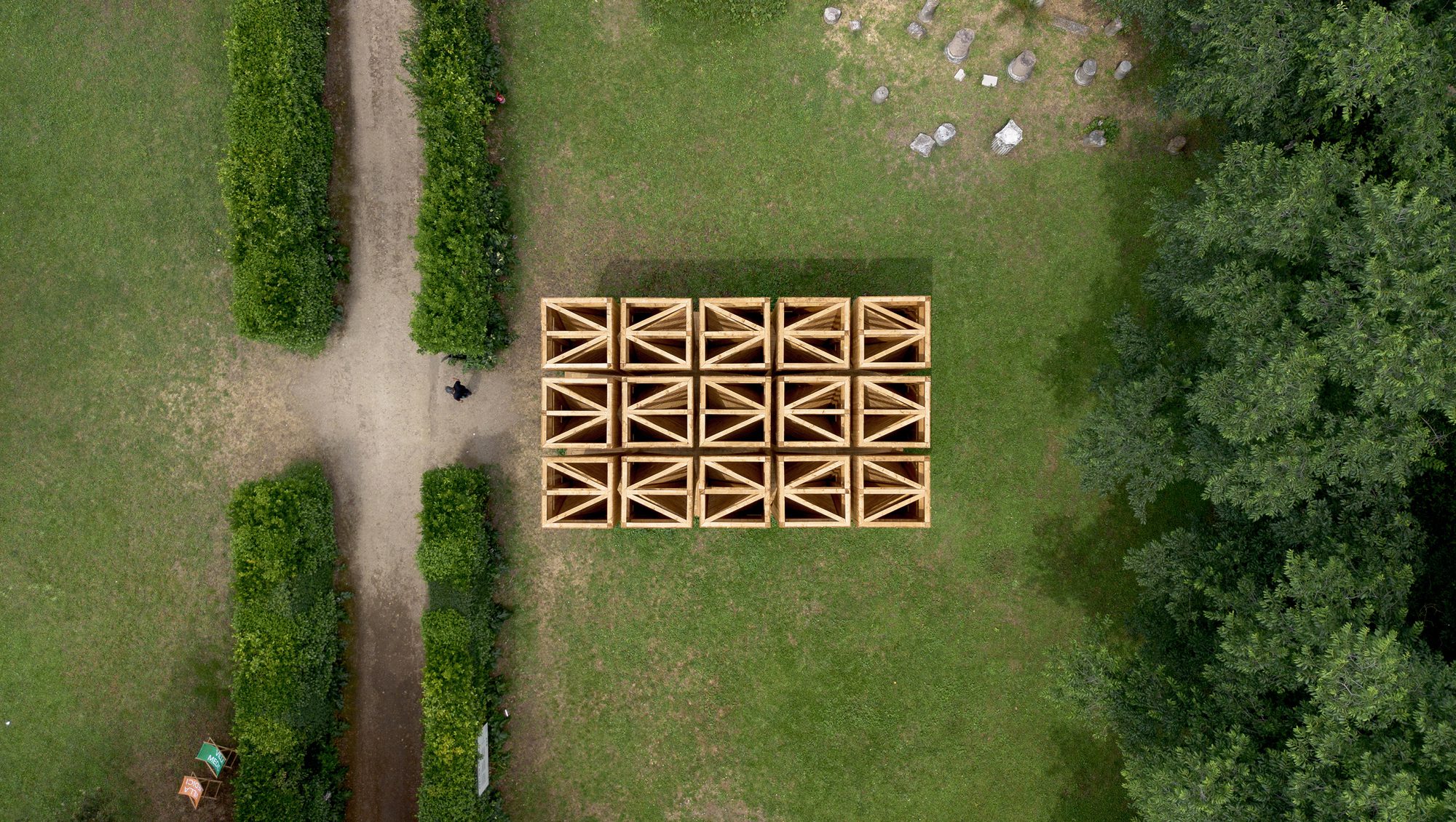La timidité des cimes Installation, A small wooden temple emerges from the gardens of the Villa Medici in Rome. Designed by Atelier Poem, the work reinvents the concept of the « cabane » through a symbolic experience, a space for imagining other ways of being together.