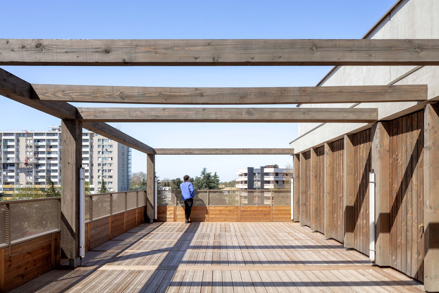 As one ascends to the Laherrère Center’s five upper floors, the expression transforms, featuring wooden façades with wood fiber insulation, wooden joinery, and warm-hued blinds. These upper levels unveil the project’s rich and diverse programming. The façade’s framework consists of pectinated fir sourced from the Pyrénées Atlantiques and Hautes-Pyrénées forests, while its cladding showcases pre-grayed Douglas fir from the Auvergne Rhône Alpes region. The building’s joinery is crafted from Scots pines native to Corrèze. Remarkably, all the wood utilized in this project hails from French forests less than 450km from the site.