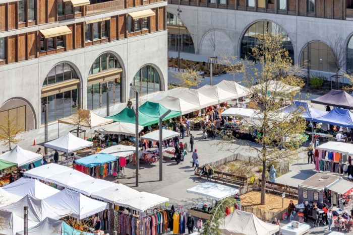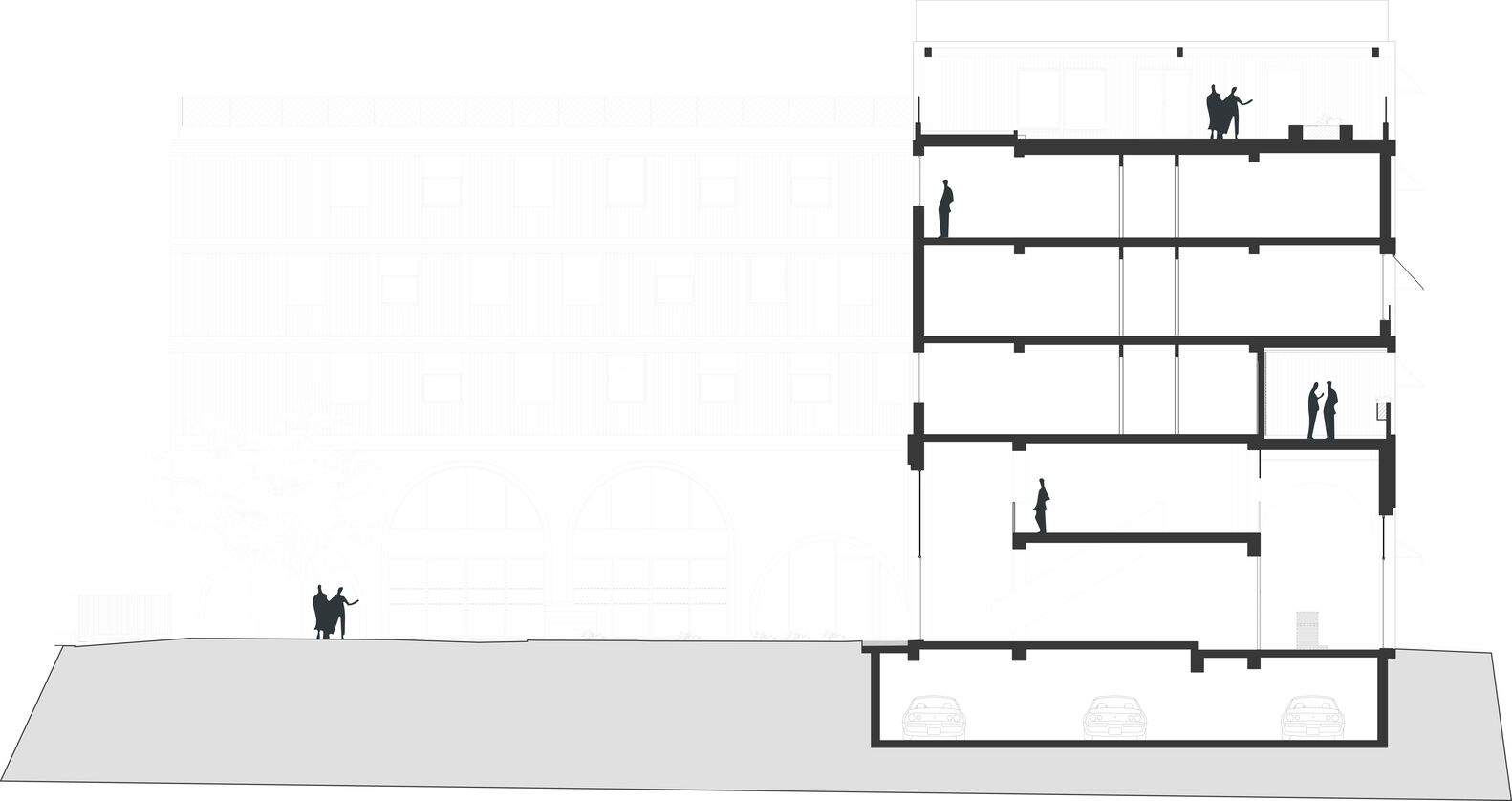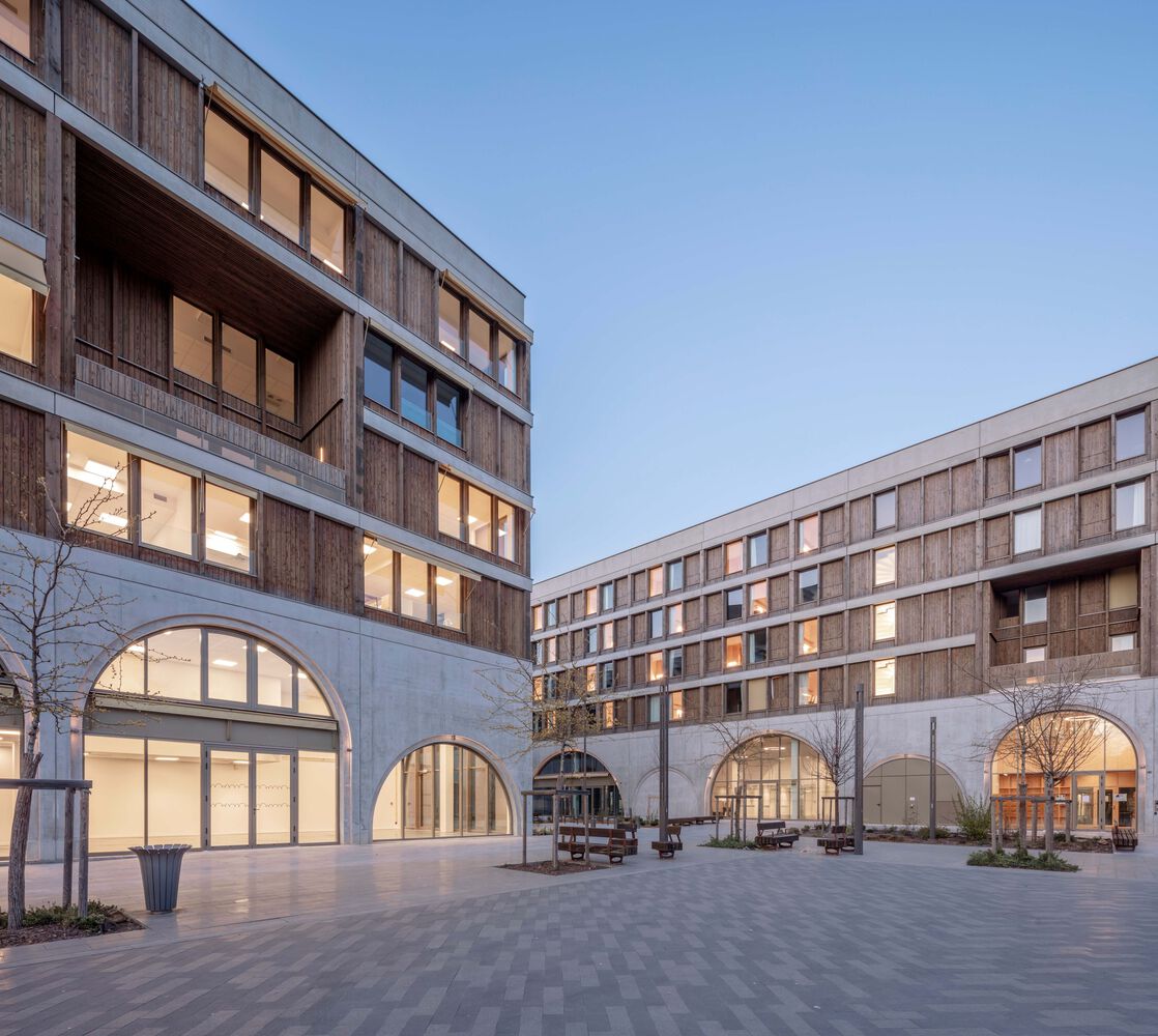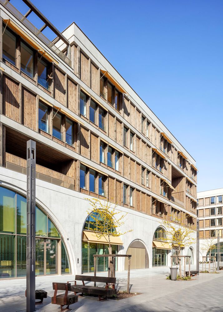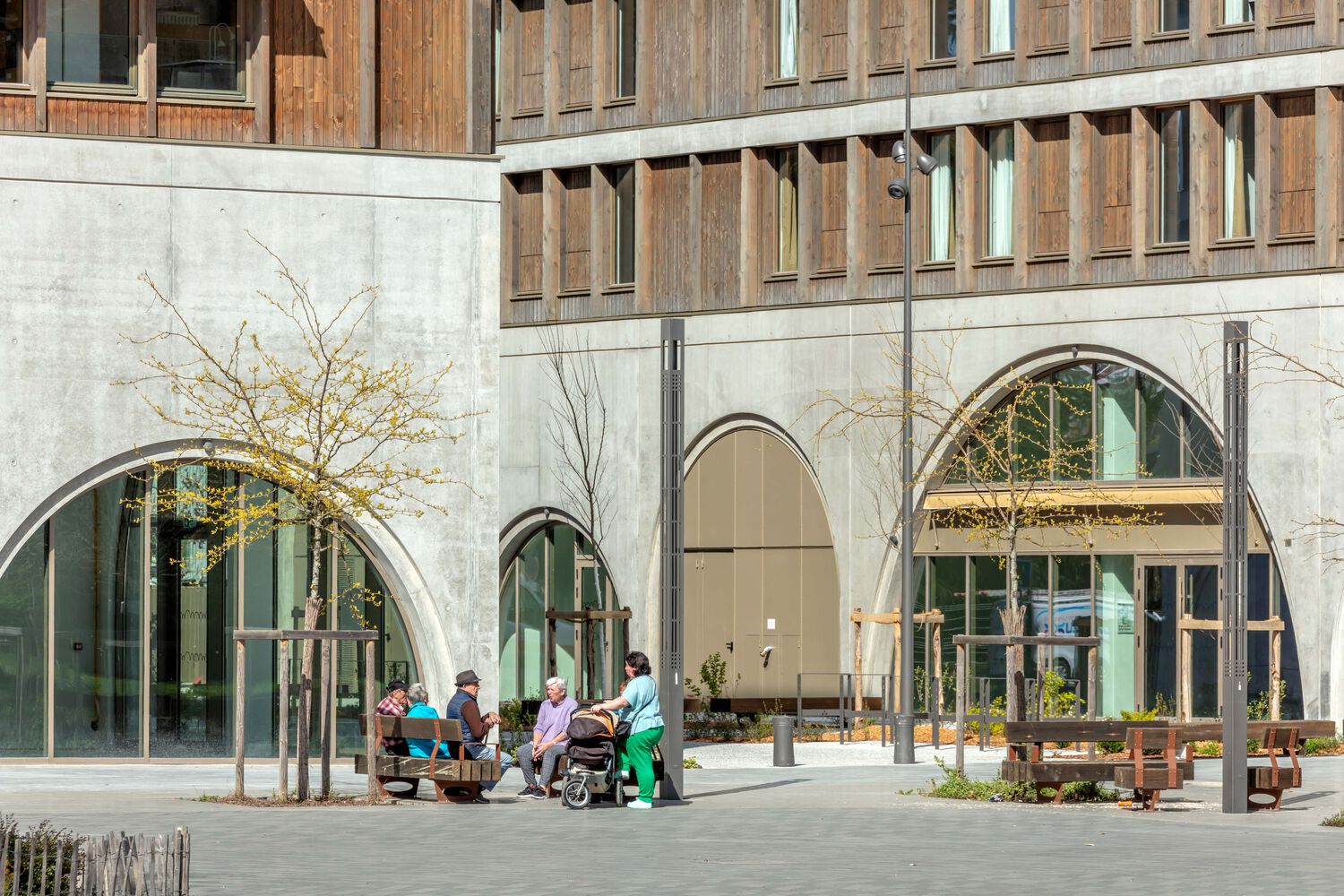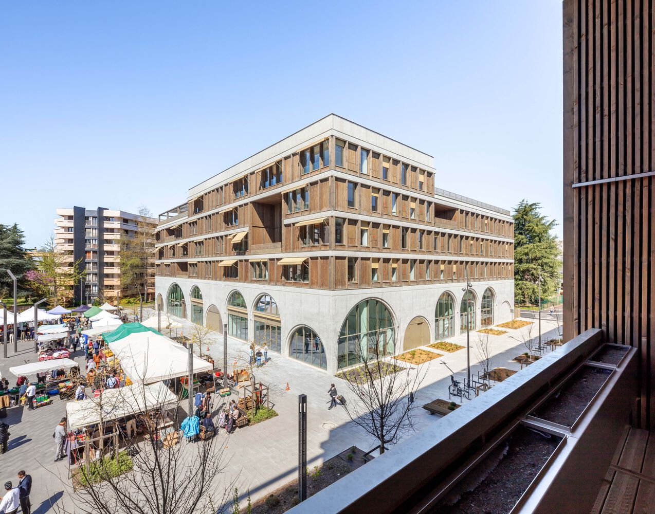 The ground floors of these two L-shaped buildings anchor firmly to Laherrère Square, featuring a uniform material composition of wood and concrete. On the ground level, these structures rise gracefully with low-carbon raw concrete arches poured on-site. Some arches, inspired by local historical architectural aesthetics, span multiple levels, not only structuring the new square but also fostering neighborhood life reactivation.
