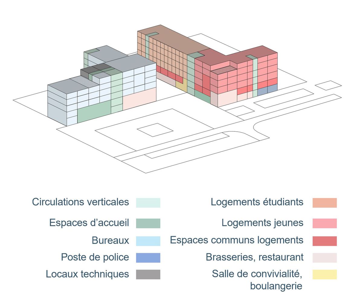 This holistic real estate complex encompasses three primary components: a housing hub featuring 116 student units managed by CROUS and 60 housing units for young workers overseen by the Habitat Jeunes Pau Pyrénées association; an entrepreneurial hub offering office and coworking spaces utilized by associations, professional training entities, and business support organizations; and local services and shops to cater to resident needs, including a police station, employment-related services, a concierge, two breweries, and sales outlets linked to craft premises.