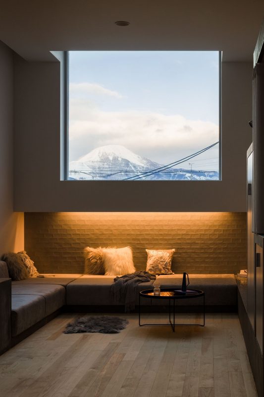 To add visual depth, an opening has been provided to the wall in the back, reinforcing the sequential space which stretches in the longitudinal direction. To the volume which is projected from the independent wall that characterizes the façade, a high-side light has been provided, blocking eyes from the environment and clipping the magnificent view. In addition, the low wall below the window has been recessed, creating a niche which makes you feel huddled and cozy.