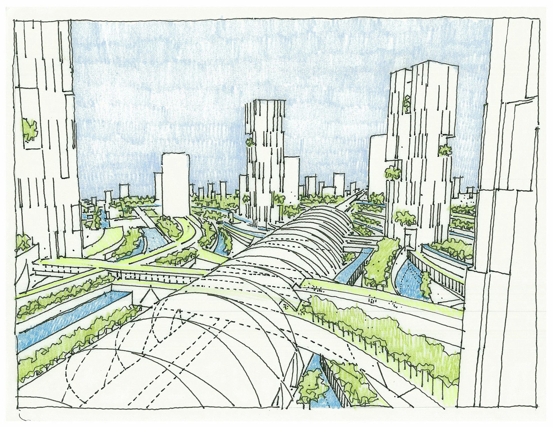 “Achieving water balance through greenbelt wetlands and aquifer recharge halting land subsidence, introducing green and blue fingers into the urban core, suturing ruptures in the urban fabric caused by the rail track and capturing water, ‘slow’ transit-oriented neighborhoods and a finer grid of walkable streets to promote social sustainability, a high energy cluster that captures waste heat to supplement geothermal sources, encouraging higher densities for more compact, mixed-use developments towards population maximum, incremental growth strategies that allow the city evolve through market forces, smart grid and real-time measurement of resources and infrastructure performance for supply optimization, distinct character to support economic investment, economic focus of education and health to sustain generations of residents, retention of local food production, farmland and model villages for artisan organic export and tourism,” are the key words HOK mentioned about his project.