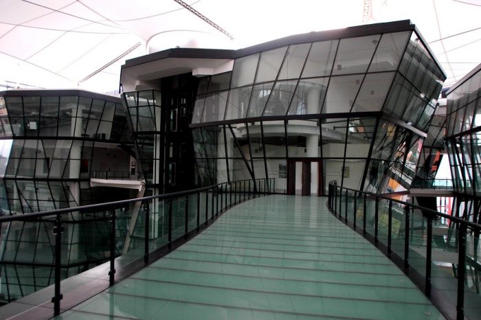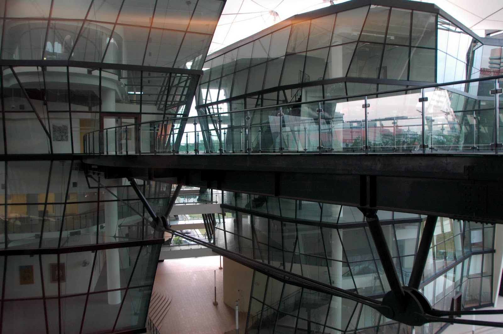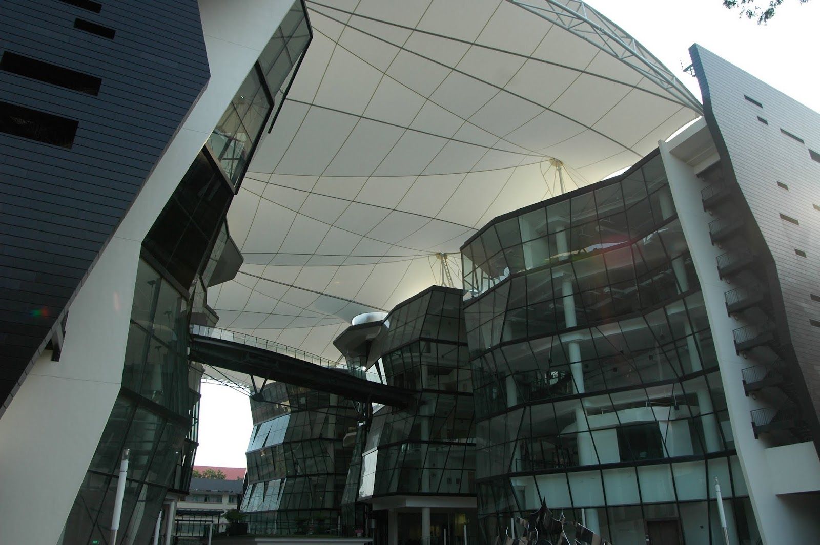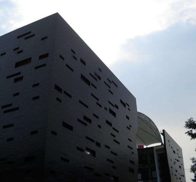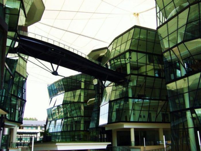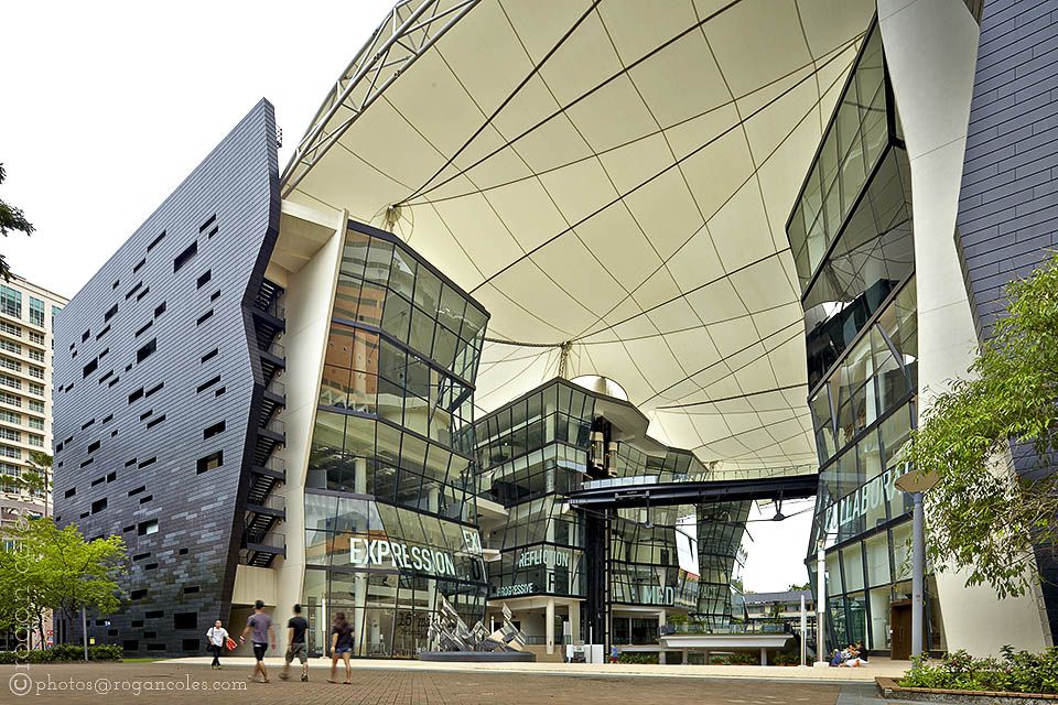 The buildings of the Lasalle College of the Arts are distinguished by facets of glass on the inside, and an external cladding made of stone and aluminium. They are linked by an integrated atrium and sky bridges. An innovative roof structure covers the entire site seamlessly. The entire campus is a living sculpture and contemporary architectural masterpiece that serves as a major landmark within the cityscape.