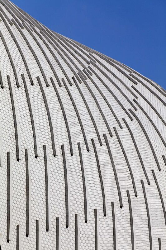 The building has already achieved LEED Gold accreditation. Covered in a reinforced concrete skin, itself clad with glazed ceramic tiles, the facade systems are designed to both lend thermal resistance as well as create a reflective heat shield using the tiles. The store will re-use rainwater for irrigation of greenscaping which occurs inside and out.