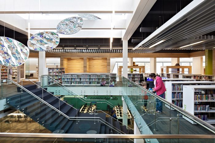 To aid in the goal of achieving a warm, open, light-filled and welcoming place, a new atrium was cut out of the center of the original library, connecting the basement level to all the way up to the new clerestory windows at roof level. A glass sculpture created by a local artist fills the atrium with a wide spectrum of color. In addition to stacks for books and periodicals, the addition and renovation provides dedicated areas for different age groups and places emphasis on community gathering places over silent spaces.