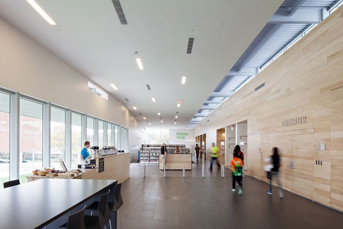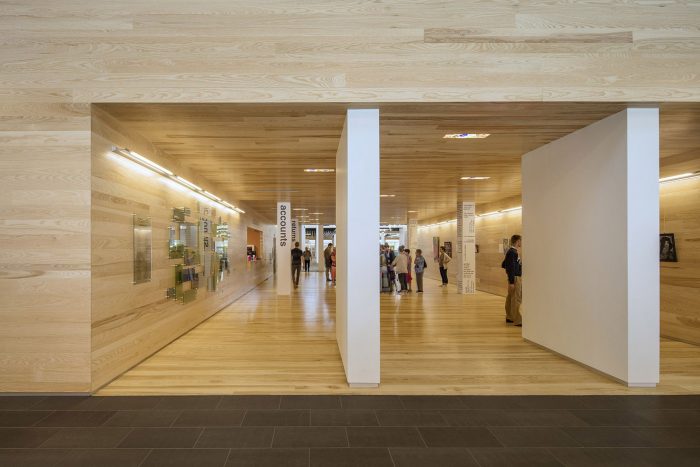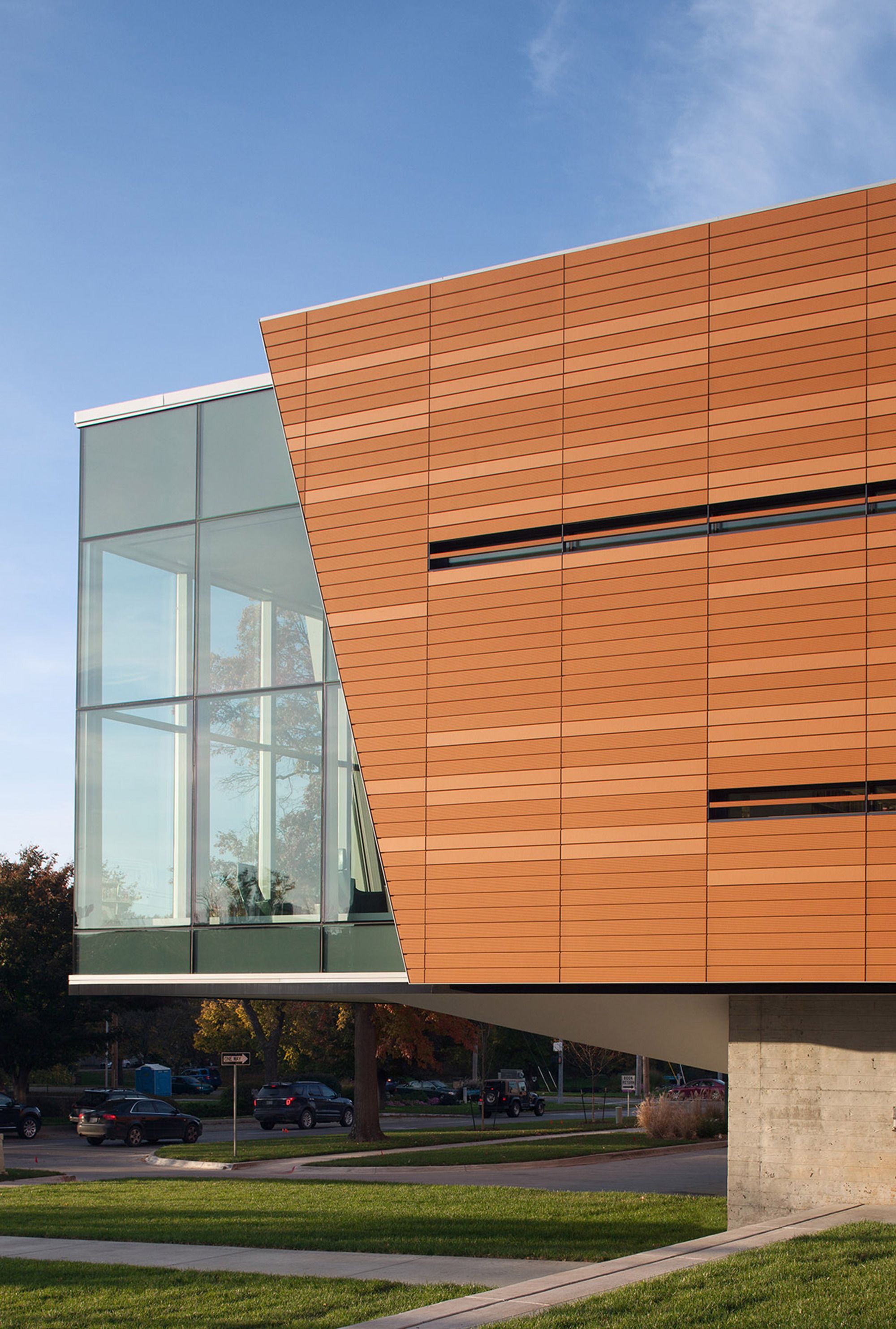 Three primary building materials were selected to work in concert with each other and convey the concept of a continuous experience for patrons. A high performance terra cotta rain screen is the primary exterior material. This was selected as a gesture to the historic red brick of downtown Lawrence while demonstrating a very modern application: its high-performance assembly helps control thermal transfer from exterior to interior. Clear-coated tongue-and groove ash paneling installed over the previous exterior walls of the original Lawrence public library form a continuous interior surface, providing warmth in contrast to the original painted concrete walls. An abundant use of glass opens the library up at each of its corners and via new skylights and clerestories, brings light into the core of the original library.