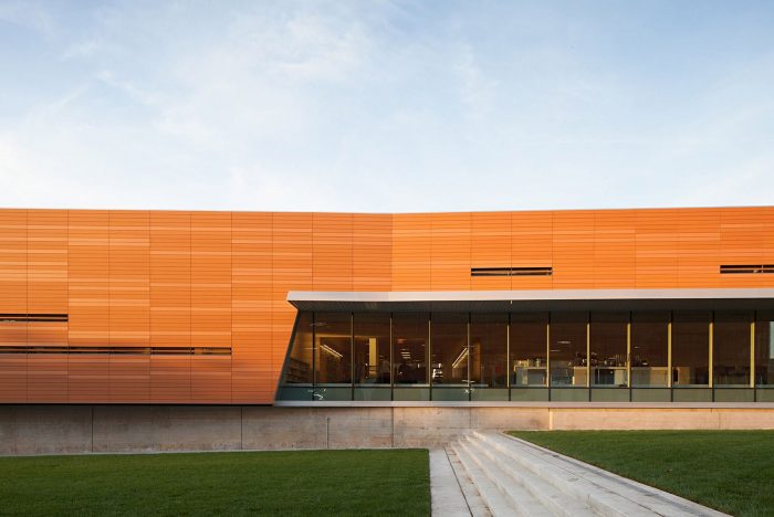 The design for the addition is based on a simple expansion diagram. A continuous reading room wraps the existing Lawrence public library on all sides, transforming it into a forward-looking, community-centered place. Each new elevation opens up to a different public constituency: neighborhoods to the west, the post office to the north, downtown to the east and a new plaza to the south. The new terra cotta façade is solid in areas where book collections need to be protected, employing long, narrow horizontal apertures to bring daylight into reading areas. Each corner is designed with floor-to-ceiling curtain walls that reveal glimpses of unique public amenities, including children’s cubby areas, teen gaming zones, small meeting spaces, and a coffee bar in the main lobby.
