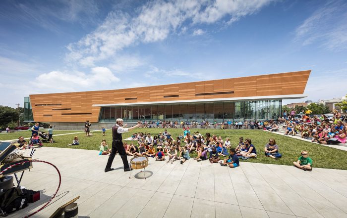 Lawrence Public Library attendance was down, particularly with younger generations. Through extensive community dialogue, the citizens of Lawrence voiced their thoughts and established key design considerations for the project, including an enhanced children’s area, greater access to technology and an emphasis on environmental sustainability. The citizens recognized the significance of the library’s location in the community and the opportunity it provided to establish a new “place” within the downtown area. Gould Evans responded with a design that addresses the changing role of the Lawrence public library: from book repository to multimedia community hub.