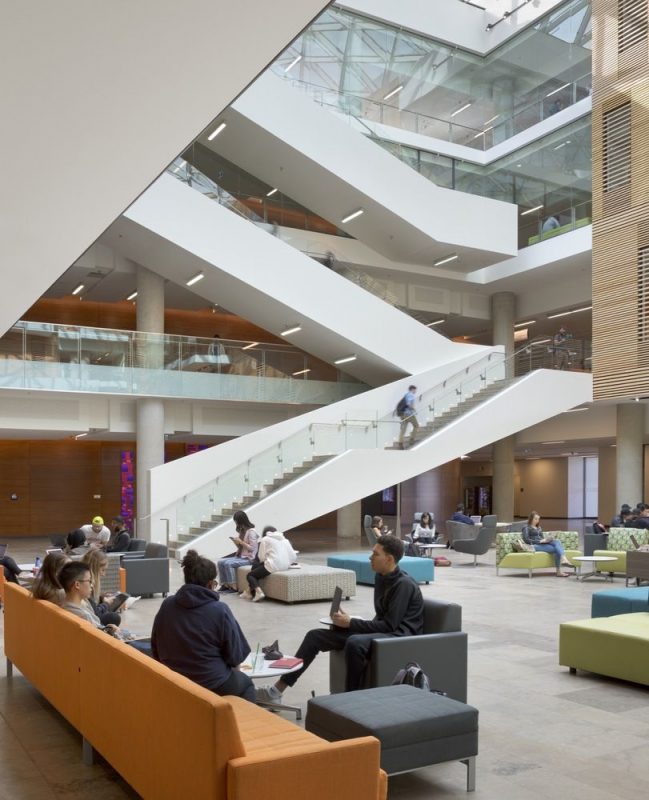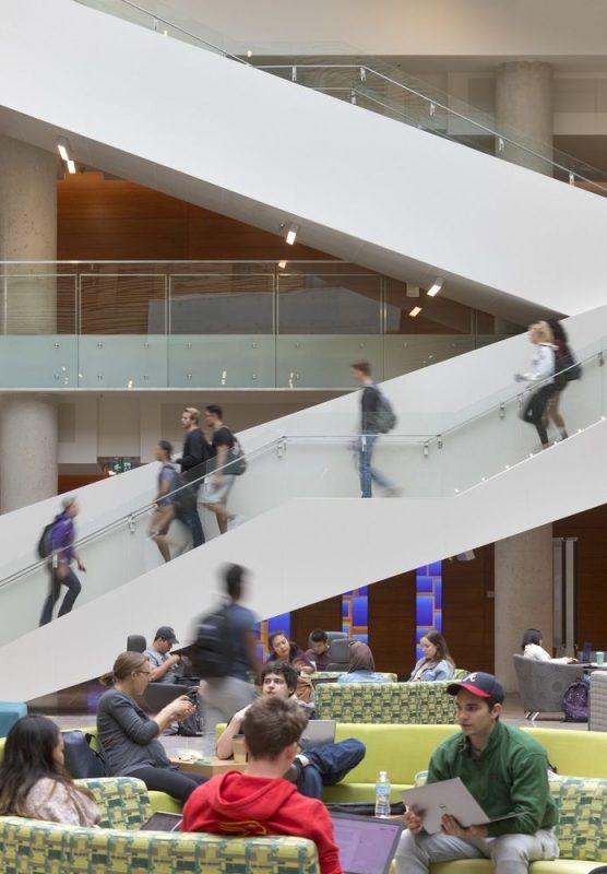 Informal study lounge space and breakout rooms interspersed around the atrium on all levels are designed to facilitate the sort of informal exchange that supports peer learning and collaboration. A range of educational settings includes active learning classrooms to support new pedagogies. A mix of academic offices (240) and classrooms throughout create adjacencies designed to break down silos and facilitate encounter. Expansive hallways with moveable furnishings and nooks further enhance the opportunity for interaction.