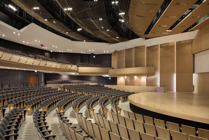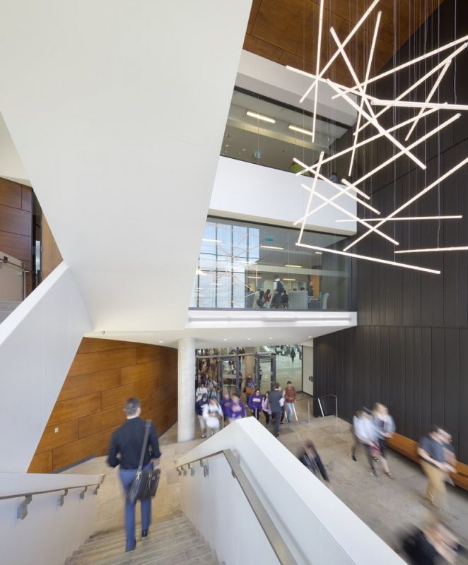 The building is designed as a landmark to create an identity and to signal an expansion of a new campus precinct. Curvilinear wood-lined volumes define large spaces at either end of the building and disrupt the rigor of the stratified orthogonal façade. These are given further emphasis by the significant cantilevered space above the 1000-seat elliptical auditorium and positioning the 300-seat lecture hall in a double-stacked drum that appears to ‘float’ above a glass-encased café.