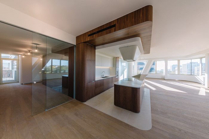 The apartments in Le Toison d’Or vary in size from small to large, enabling a varied demographic of city residents. To ensure high levels of daylight in the interiors, the floor to ceiling heights reach at least 2.7 meters in living areas. For the apartments situated along the Avenue de la Toison d’Or, this height increases to more than 3 meters. Open kitchens in the form of large furniture elements create an informal entertaining space in the heart of the apartments and determine the circulation through the spaces. Le Toison d’Or has been developed with high standards of sustainability. Main features are the excellent thermic isolation of the façade (including triple glazing), a high standard of acoustic insulation, an inventive cogeneration installation system for both the apartments and the retail units and the use of glass-fiber reinforced concrete.