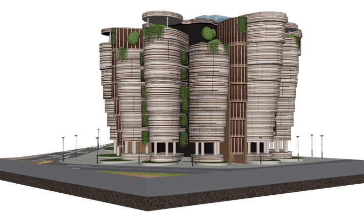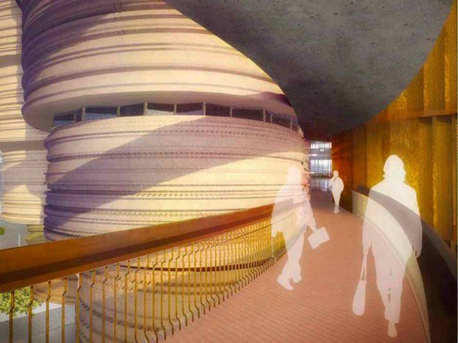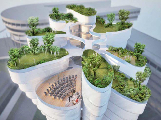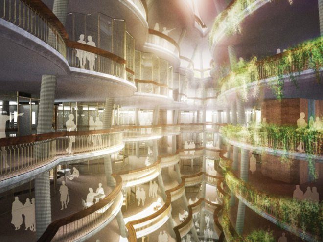 The hub’s form is dictated by its function, and brings together 55 tutorial rooms into a structure without conventional corridors, which have traditionally created social separation and isolation. The learning hub has no one door, it is porous. Students can enter from 360 degrees around into a large central space which links all the separate towers together. Each tower is made up of a stack of classrooms which build up gradually, with gardens on selected floors.