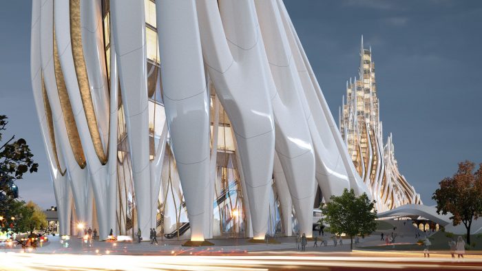 The towers rise from the ground, looking like a sculpture with smooth curves culminating in sharp edges, perhaps a marriage of the works of Zaha Hadid and Antoni Gaudi? For the students, the inspiration for these sculptural towers has been Hadid’s work and biomimicry. The complex consists of a high-density tower, a mid-rise block and a train station in between the two and a landscaped park.