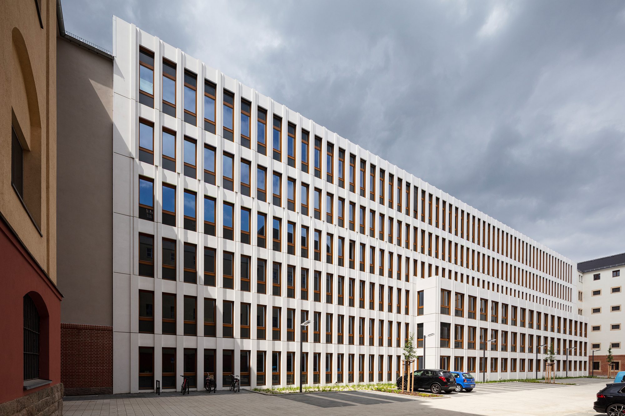 The spatial program for the Leipzig public prosecutor’s office with 252 employees essentially includes office, record and meeting rooms, archive and registry areas as well as storage areas for evidence. As this is an investigative authority, very high-security requirements had to be taken into account for the location of the public prosecutor’s office. The construction project included the renovation and conversion of the listed existing buildings along Arndtstrasse and Alfred-Kästner-Strasse as well as a new connecting building in the inner courtyard of the area.