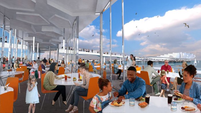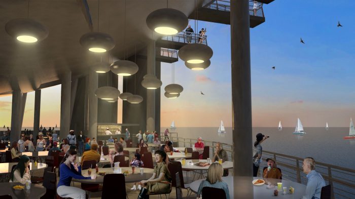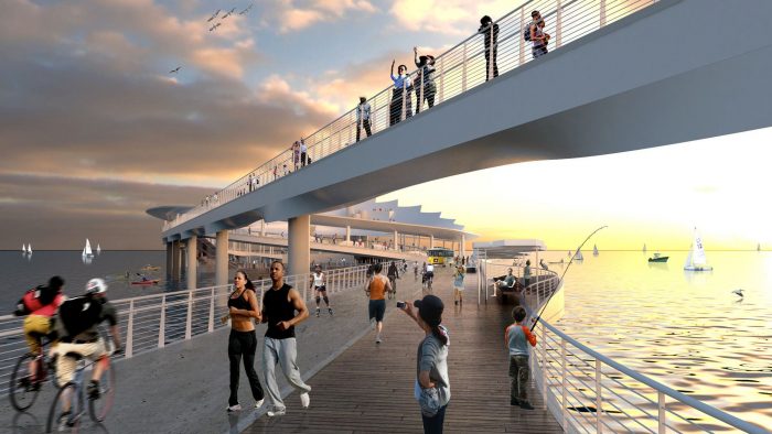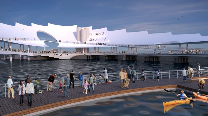 Like a magnifying glass on the water, the new Pier acts both as a lens back to the City and a window into the underwater world beneath. Looping out over the water from the shore, the Lens provides views of the bay below and sky above, framing and highlighting the reciprocal relationship between the City and the Bay. Rising above the water, the crenellated form of the Lens canopy evokes waves or sails, a crown on the eastern horizon. Twin bridge paths that extend out and back from the uplands, eliminate the traditional unidirectional path typical for a pier and instead creates a circuit that allows for a wider variety of experiences as visitors walk to the Pier’s length, take in the waterfront vistas, and return back to the City.
