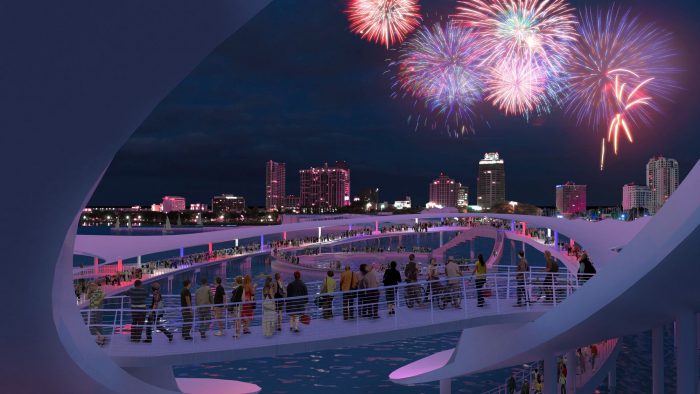 The Lens is a new icon for the City of St. Petersburg, reframing the relationship between the City and the Bay. Visible from afar, it is a crown on the skyline and a marker within the daily life of St. Petersburg. Embracing the water at its center, it is a loupe focused on the water, an observation point for the sky overhead, the water below, and the city skyline beyond. This is a new space for collective experiences for individuals, families, and the residents of St. Pete to gather, to play, and to celebrate, whether for an afternoon walk, weekly farmer’s market, seasonal festival, or large annual event like July 4th.