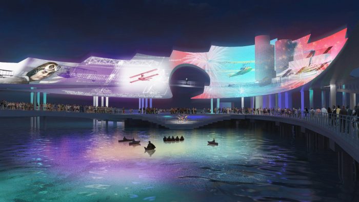 As its canopy rises over the Bay, the Lens incorporates bicycle and walking paths arcing upwards before returning to the water’s edge. Its broad form shelters the main promenade from the hot sun and the rain, and creates a welcoming space for visitors as they arrive on foot, on bicycle, or via the Pier Tram. Elevators and stairs bring visitors up to a series of viewing decks with unprecedented views of the city skyline in the distance. An oculus inscribed at the far end of the loop opens and connects the world within the Lens and Tampa Bay beyond. At night, the surface of the canopy can become an extraordinary surface for video projection, for performance, and for art. Patterns of light, color or even clouds can track across its surface and will be visible from the Amphitheater and the surrounding city. The Lens will be an active extension of the city skyline on the water.