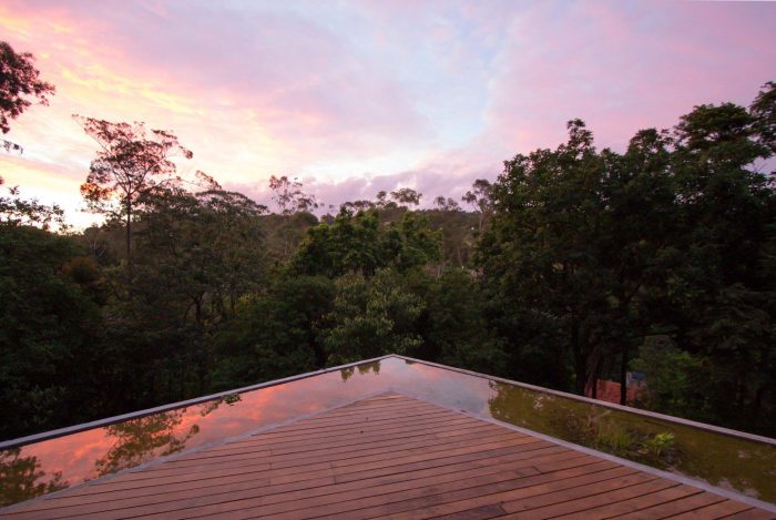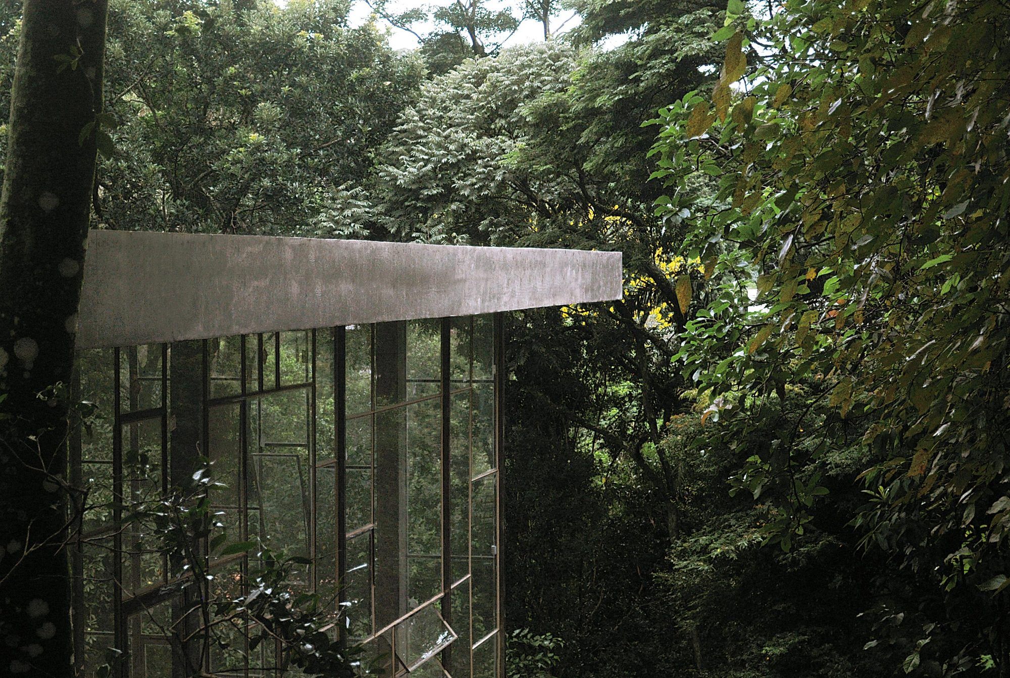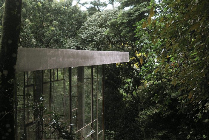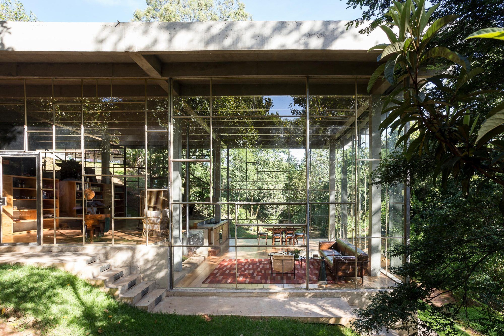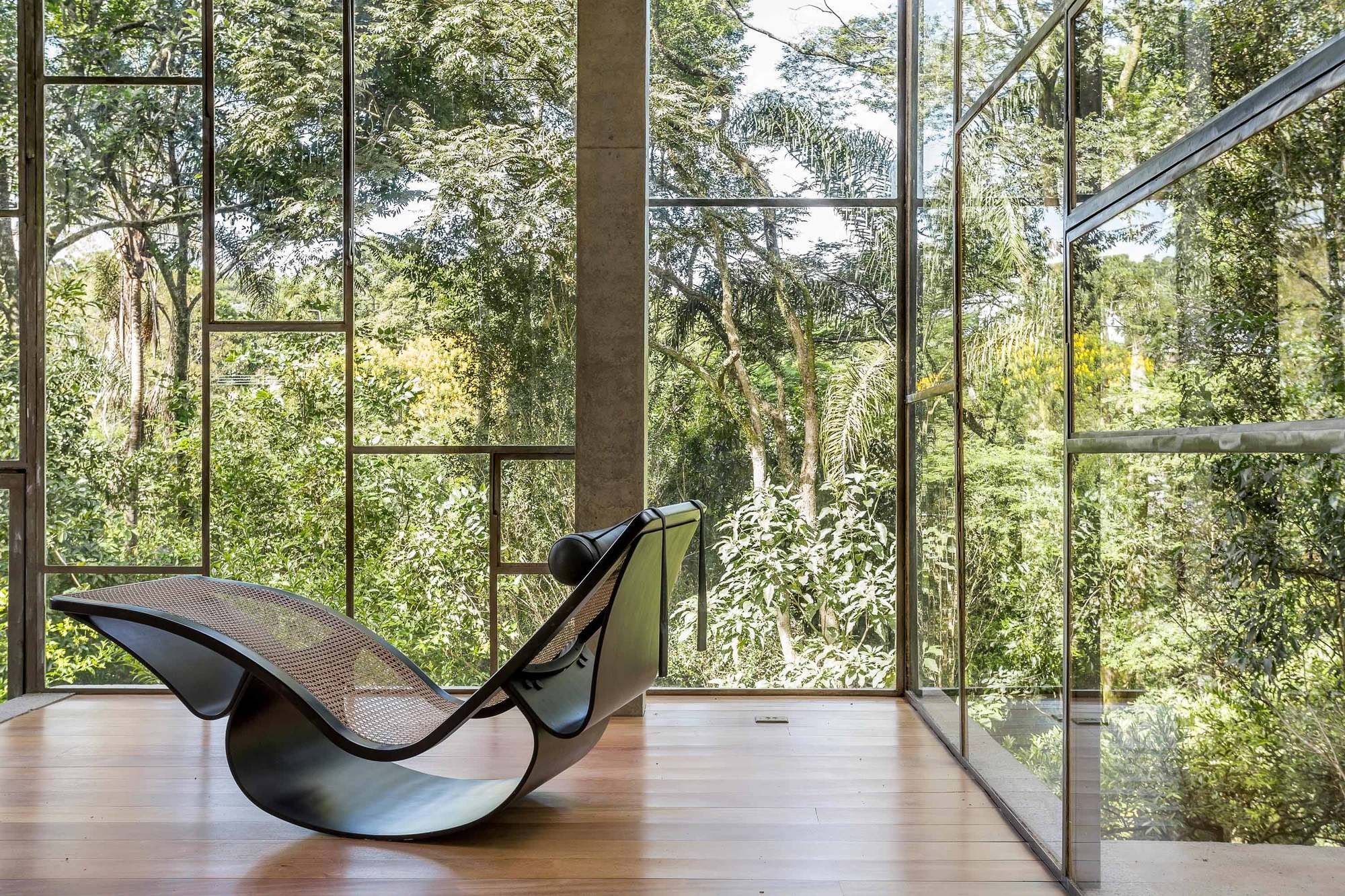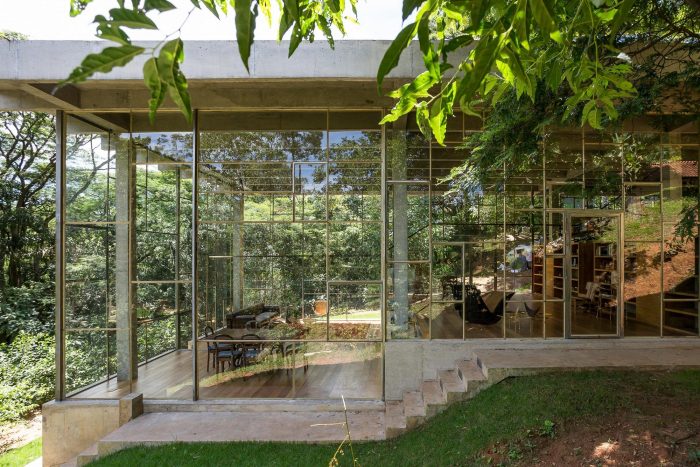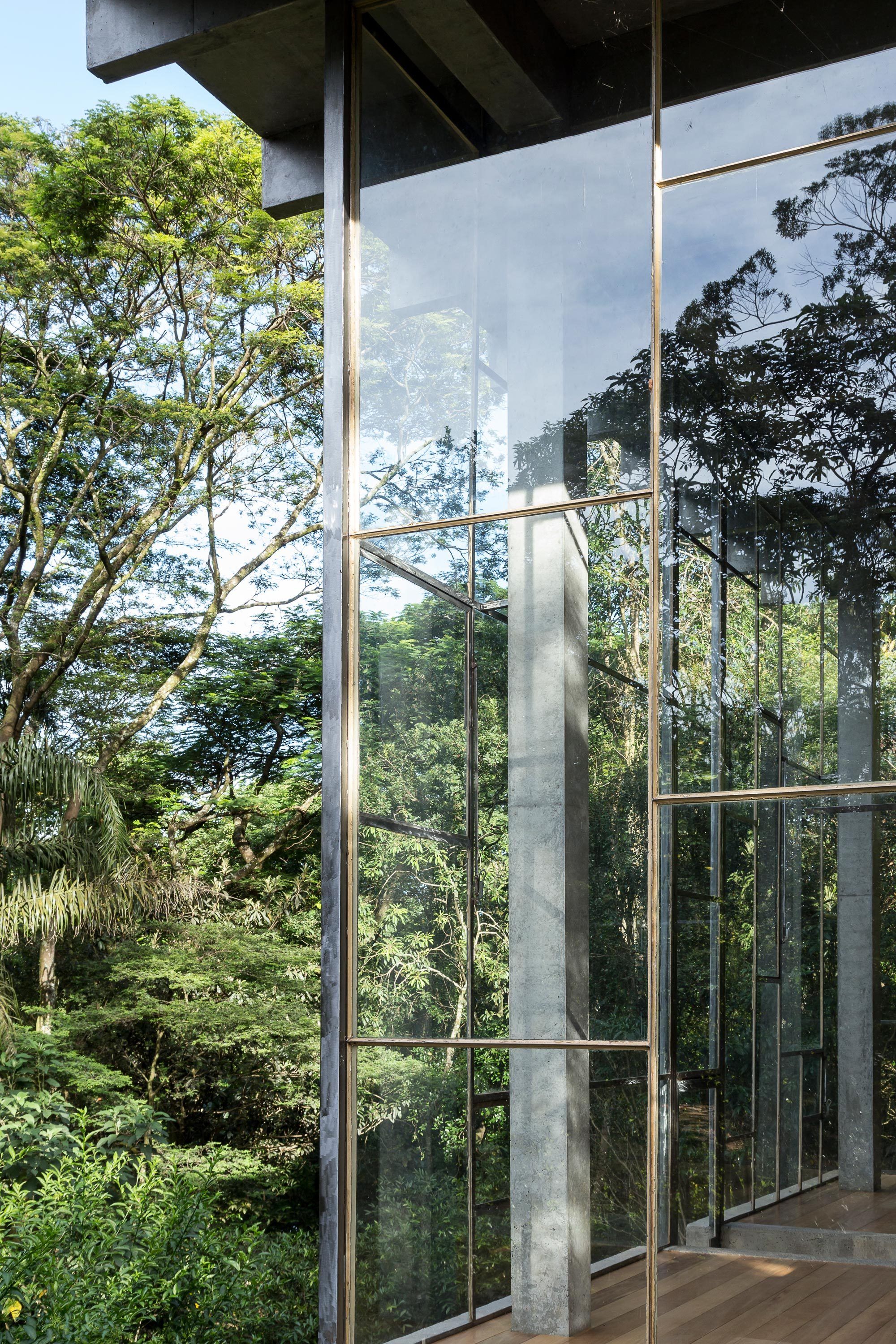 The neatness of the architectural layout, is even further corroborated in the positioning of the stairs. These, rather theatrically transverse the space along its central axis to loop symmetrically around the perimeter of the house under a concrete-paved, covered pathway. But perhaps, the most significant aspect in giving the project it’s somewhat rudimentary grandeur is the selection and treatment of the materials deployed. The bare structure is realised entirely out of reinforced concrete and was cast under the direction of the architects within a single working day; the floors, as with the upper terrace, are lined with long and fine Garapeira wood boards placed perpendicular to the project’s longitudinal axis; and the whole is almost entirely wrapped within a single glazed facade of which the iron profiling and design motifs follow the iconic ‘paulistana’ tradition of the nineteen fifties. It is especially the care gone into the design of these latter elements that have made the fortune of the project of which the noble spareness could’ve easily been buried under the hideous chunkiness of modern-day aluminium frames. Instead, with its fine joinery and quasi-ethereal openness, the Casa Biblioteca consolidates its place amidst a rich tradition of glass houses and pavilions which since the dawn of twentieth century have almost persistently affirmed themselves as privileged sites of architectural experimentation.