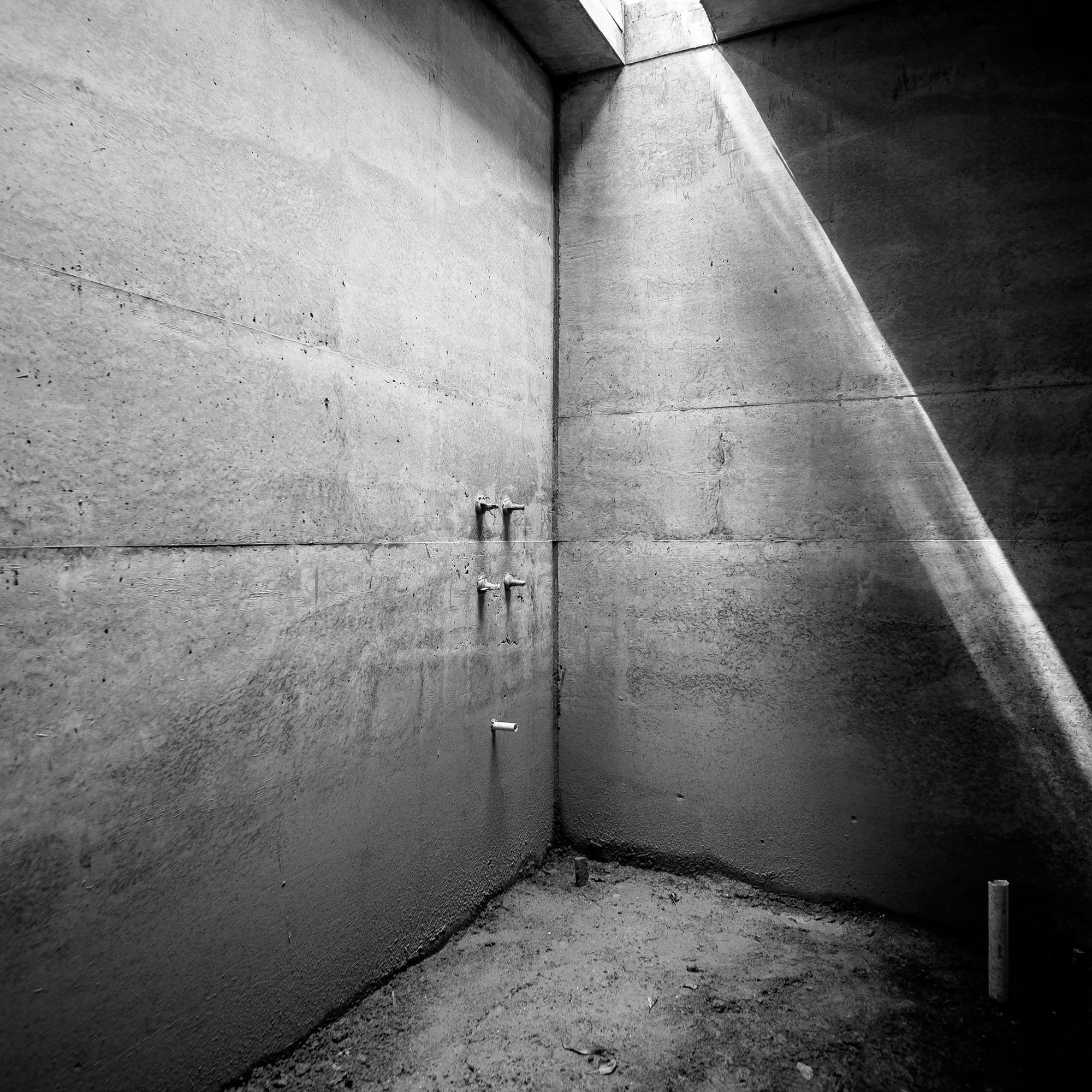 A similarly methodical approach informs the location of the core services and storage facilities required by the client which are either carved into the project’s retention walls—as is the case with the two bathrooms along first terrace wherein all elements are entirely realised in in-situ cast concrete and which, differently from all other areas of the home, are toplit and thus bare no visual connection whatsoever to the exterior—or fitted accurately against them—as with the kitchen elements, bookcases and wardrobes. As such, the space remains untethered from elements foreign to its ‘disegno’.