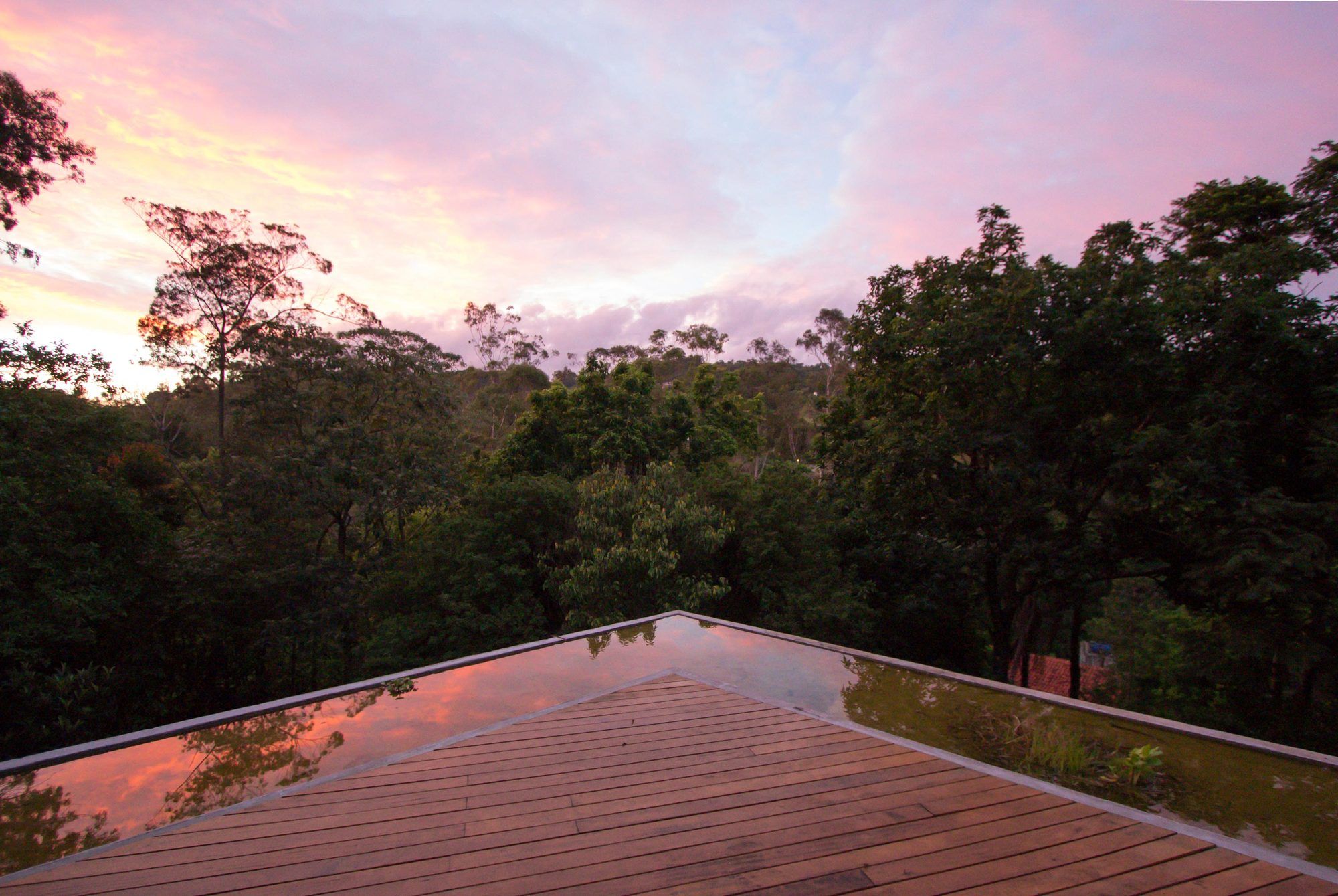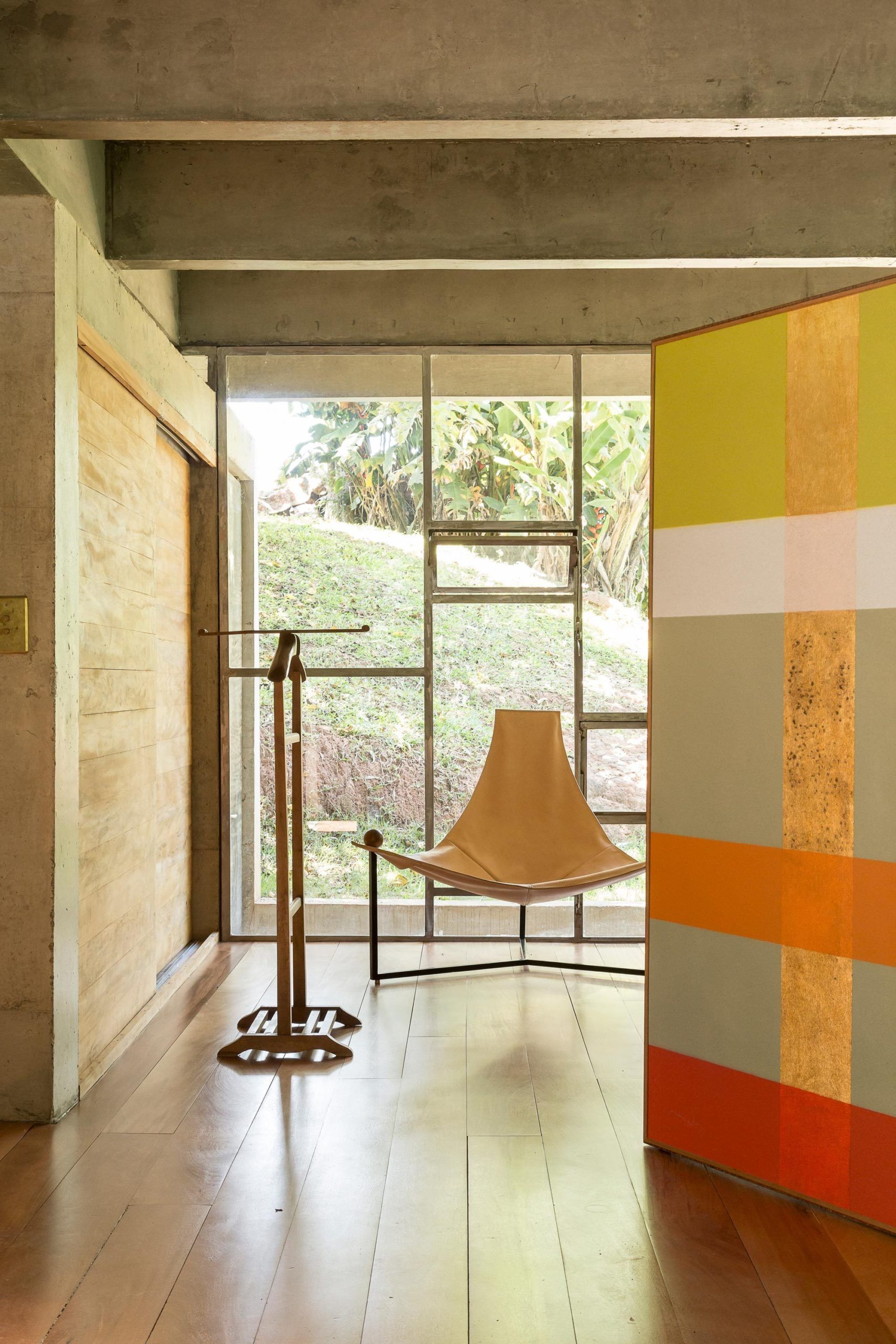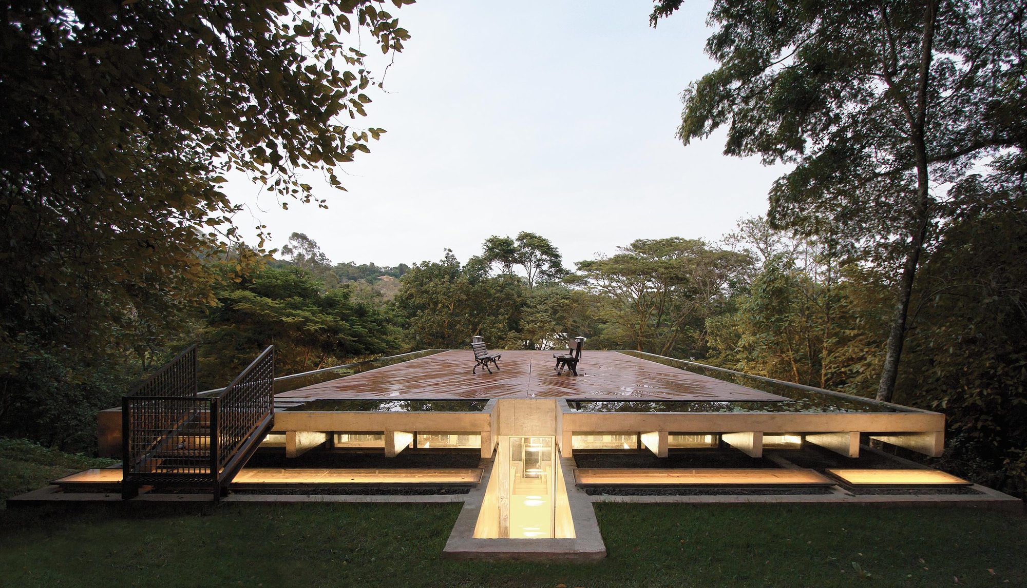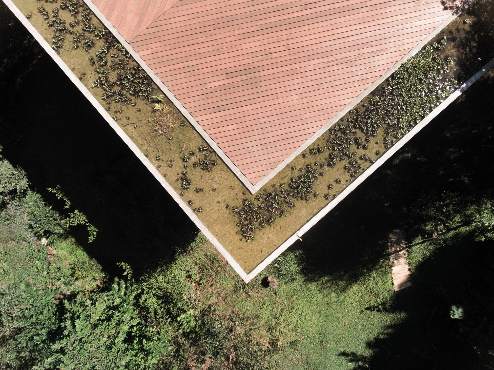 Ever a topos of Brazilian postwar architecture from Artigas to Mendes da Rocha, here too the concrete roof takes on a crucial role in the determination of the project both in the articulation of its program as in the characterisation of its outwards (and inwards) appearance. It is a 15 cm thin rectangular slab supported by eight long-limbed pillars which, albeit ‘basic’ in its formal resolution, distinguishes itself for the uncanny slenderness of its constitutive parts. When approaching the house from the main road, it is the upper face of this element that presents itself to the viewer offering access to a monumental viewing platform of ca. 20 by 10 meters, immersed within the foliage of the surrounding tree canopies. In place of a parapet, the deck is circled by a meter wide water bed which, in turn, defines a rectangular central island from which to contemplate the view. This latter is lined with finely cut Garapeira wood boards which meet diagonally against the deck’s symmetry line and point towards the horizon.