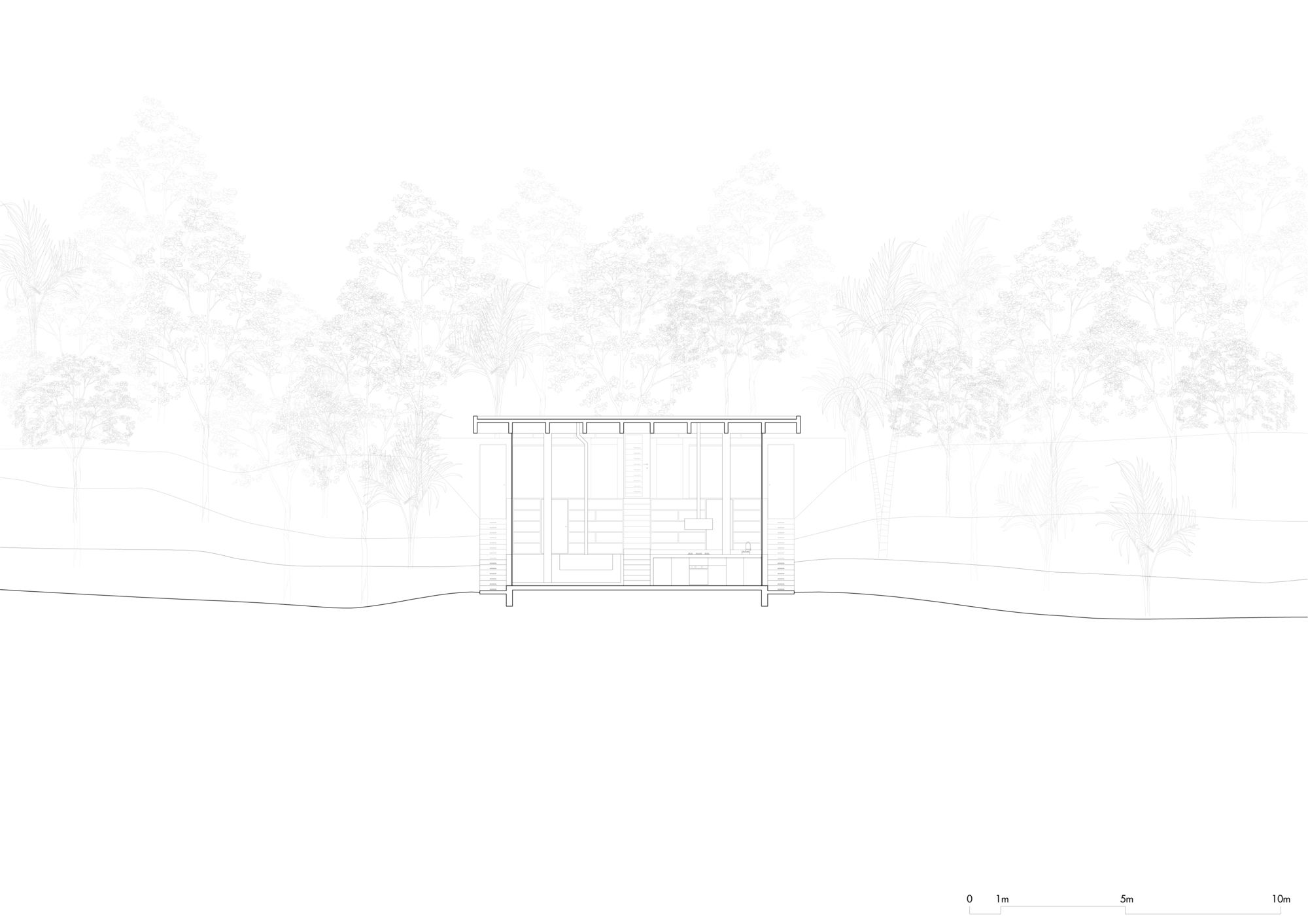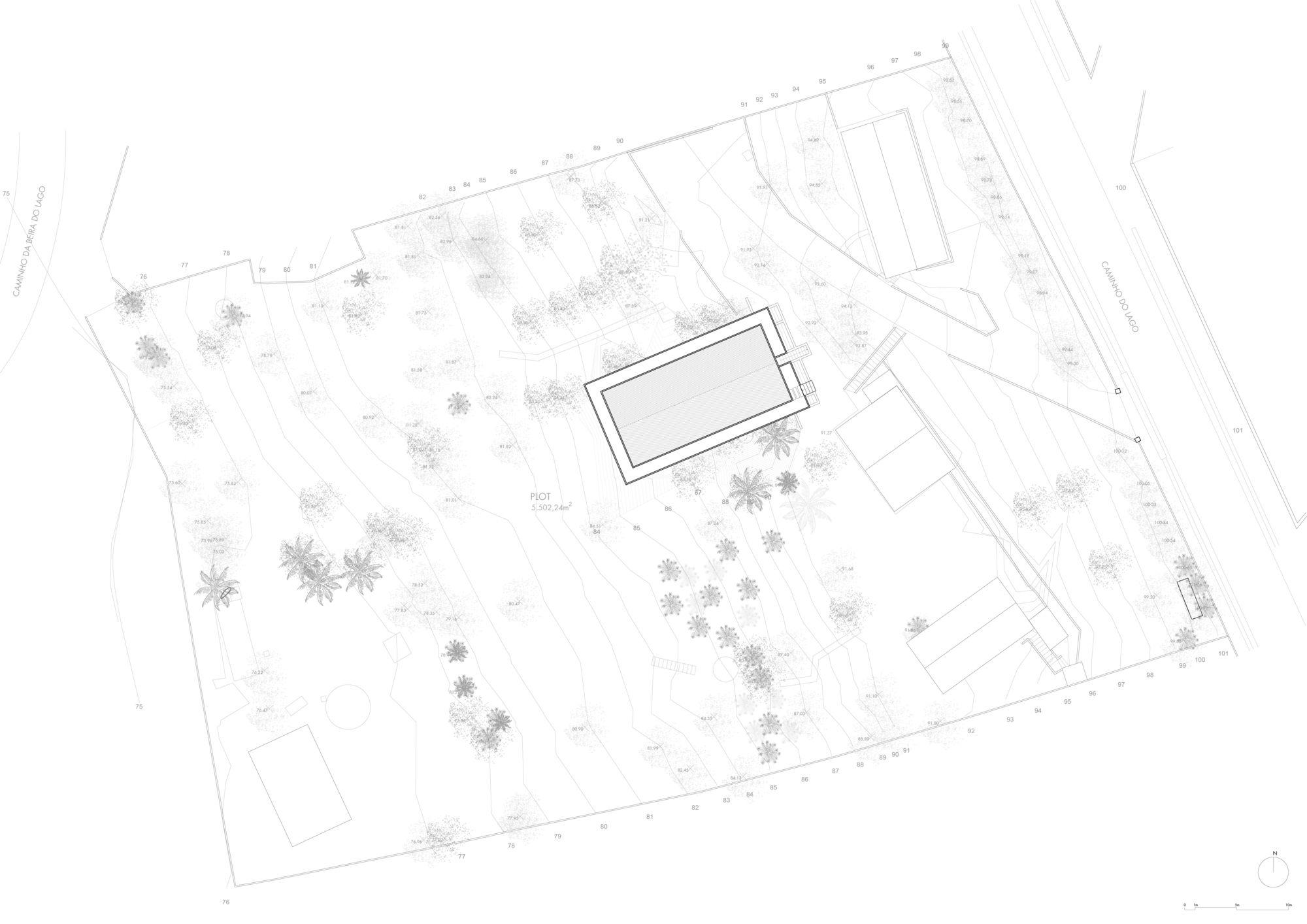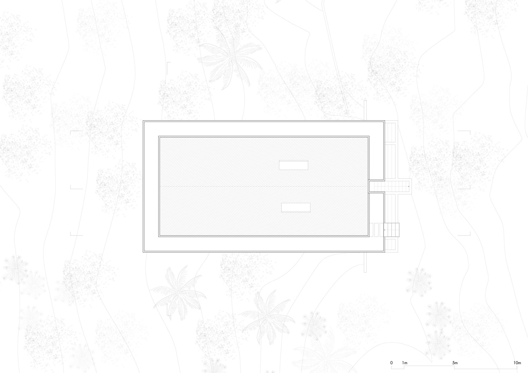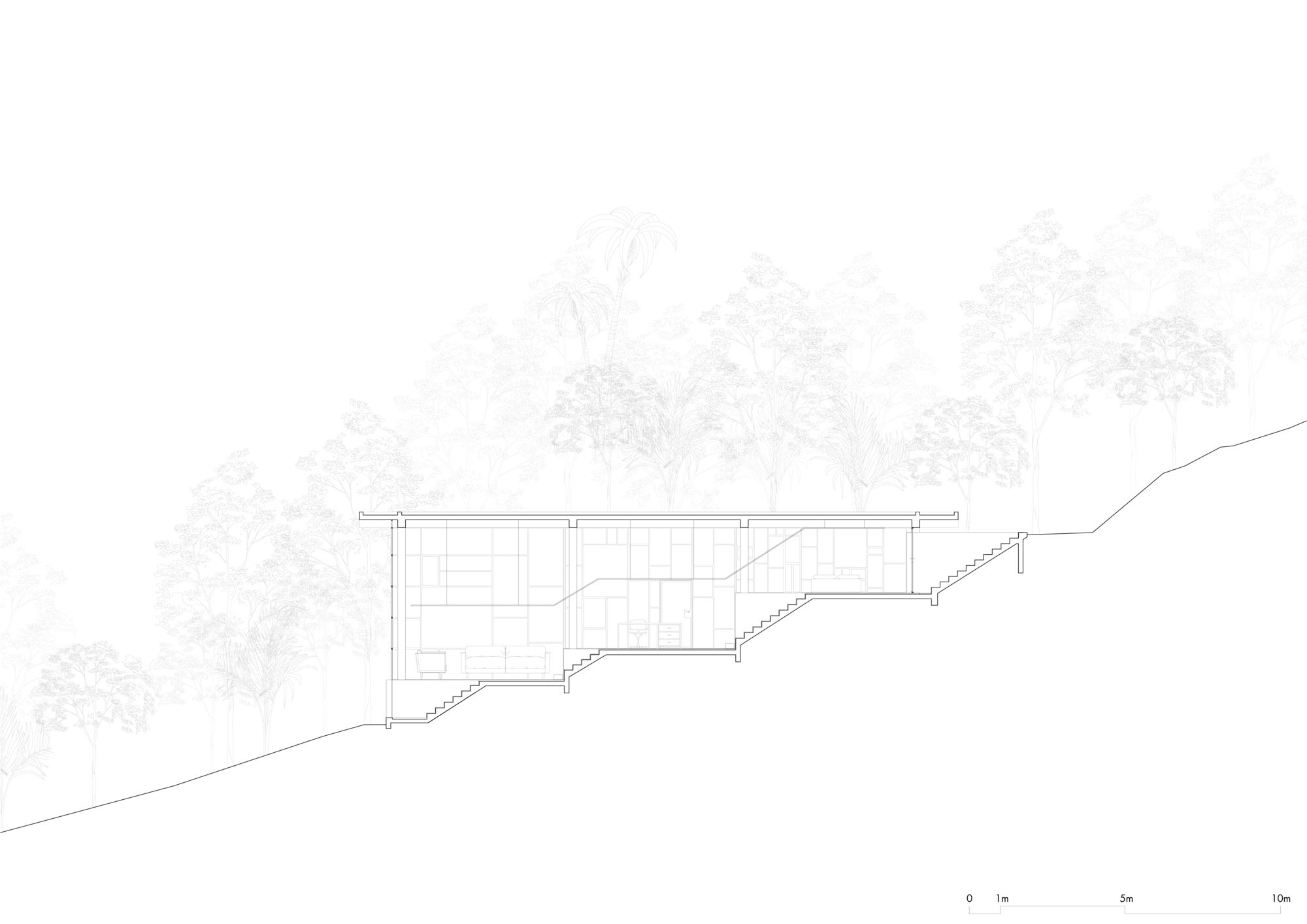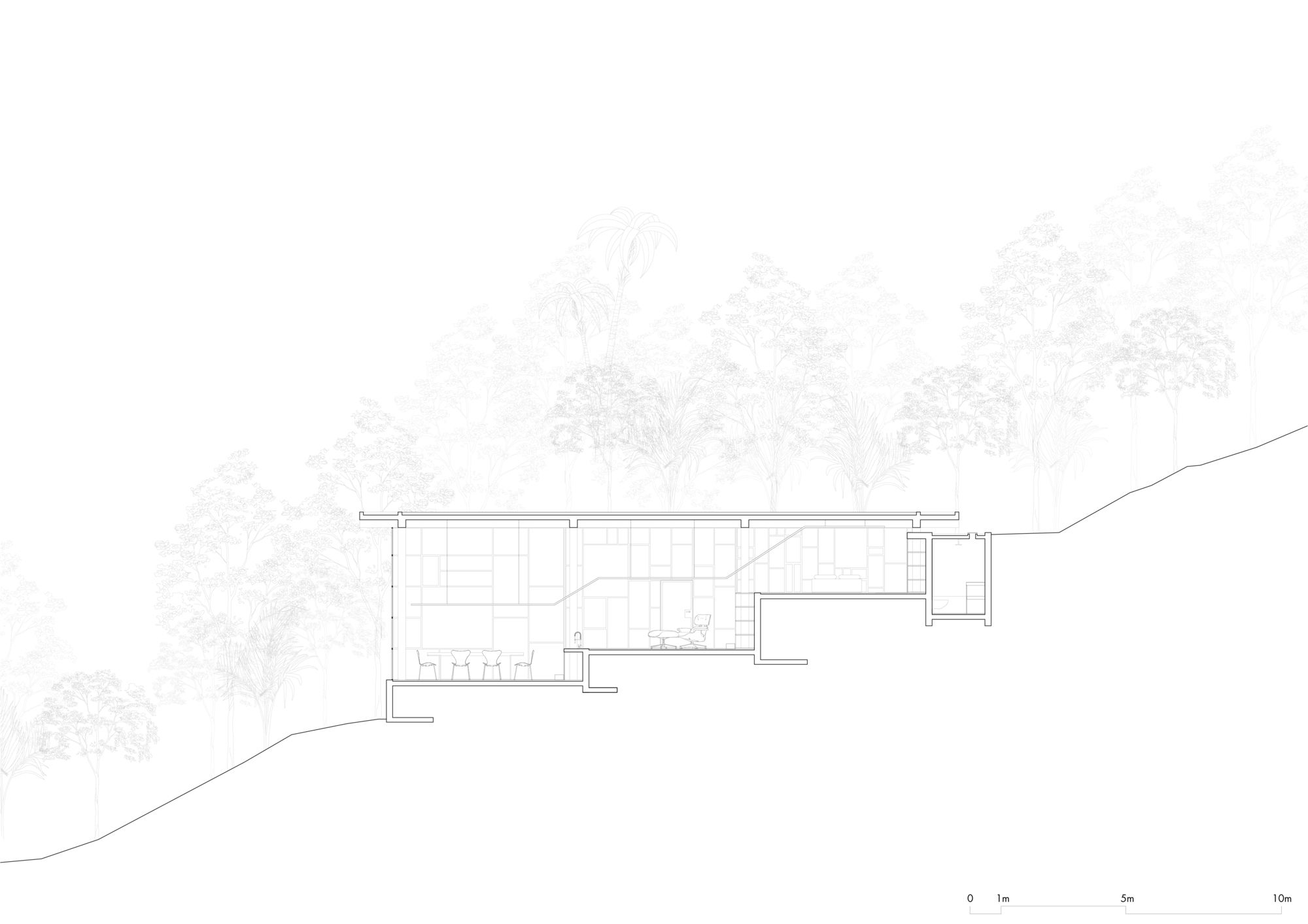 Belonging to this later series, Casa Biblioteca is without doubt the most idiosyncratic of the bunch, both for the eccentricity of its client and the context it was born out of. It is, in fact, set atop of a steep north-facing terrain within a clearing of Vinhedo’s dense ‘mata atlantica’—the atlantic forest which extends over the larger part of Brazil’s littoral region. Due to the site’s topographical attributes, its design follows a distinctly ‘sectional’ rationale such that the spatial and functional disposition of the project is almost entirely articulated in the relation between two contour lines. In order of relevance, the first of these two lines consists in the line of the ground, of which the sloping profile has been manipulated to form a series of spacious horizontal terraces, fit for inhabitation; the second consists in the line of the roof, which ever so slightly hovers over the terrain’s uppermost retention wall to create a sharp, horizontal datum between the domesticated topography and the sky above it.