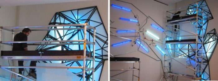 Hendee uses polypropylene, black tape, glue, fluorescent lights and colored gels with such creativity and efficiency that he creates a new distorted environment in each work often called ‘light sculptures’. Even though the components used are less, it does not affect the impact created by these masterpieces in the slightest. Due to the use of black tapes, the compositions stand out in the forms of straight lines. This enhances the whole form by appearing simplistic yet interesting.
