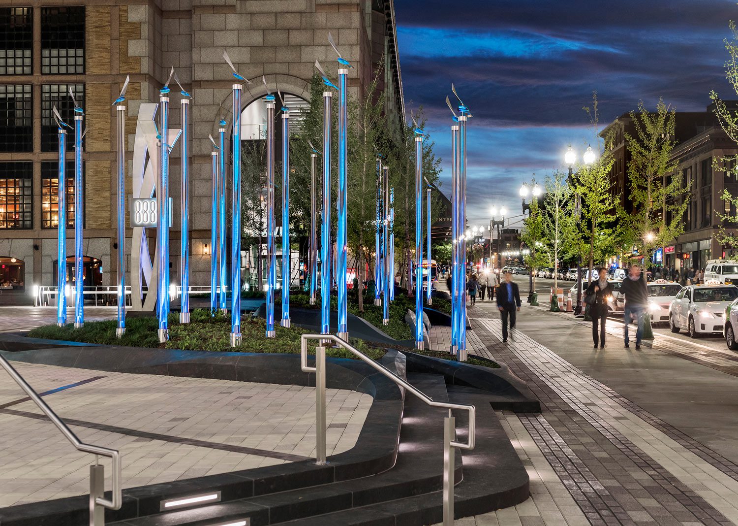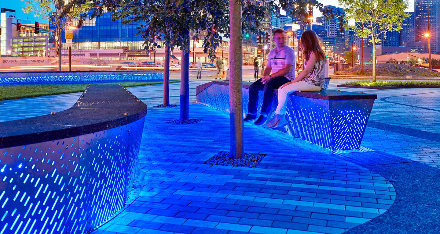 Designed by Mikyoung Kim, the plaza’s lighting effect creates a fun-filled nighttime experience. The designer enhanced the landscape by using special blue colored LED lights which flow in fiber optic linkages to indicate the historical course of rails in this area. This cold neon color not only evokes playful activity in the space but also connects it to the nearby waterfront. The blue shade further extends to the site furniture to blend it with the landscape.