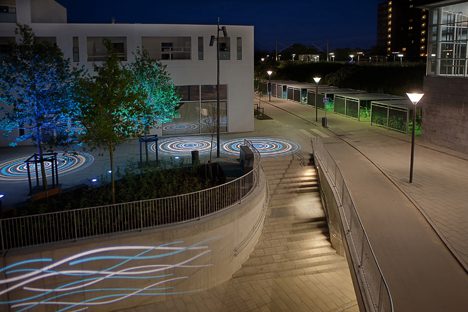 Finsbury Avenue Square was a dark uninviting space that was revitalized by Skidmore, Owings & Merrill (SOM) through creative lighting. They installed 100,000 LED lights in the grooves between the tiles and covered them with frosted glass. The resulting LED-frosted-glass grid generates subtle color changes that are reflected by the glass façades of the surrounding buildings. Consequently, these ever-changing light scenes create a lively plaza at the heart of London.