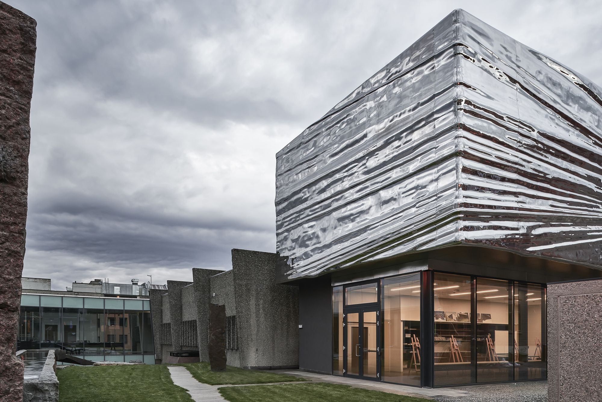 artist Jakob Weidemann (1923-2001). The gallery’s striking metallic wrapping reflects the surrounding context and changes its appearance with the light. The façade was created by late Norwegian artist Bård Breivik (1948-2016), and it is conceptually rooted in the sculptural idea of a shooting star, a dramatic symbol of the importance of Weidemann’s contribution to Norwegian painting. The façade is made from driven, highly polished stainless steel, with reliefs at approximately 25cm deep.