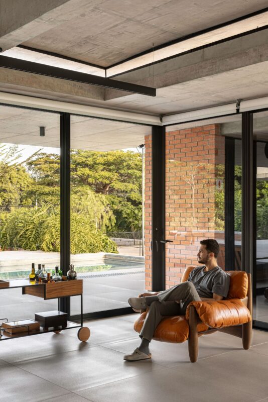 Inside the central area of the house, most of the internal spaces function as “neutral boxes” with white walls and ceilings, while the extension of the concrete pillars and beams structure was left exposed in the internal gardens and throughout the perimeter of the house, forming a kind of “protective layer,” in direct contact with the elements.